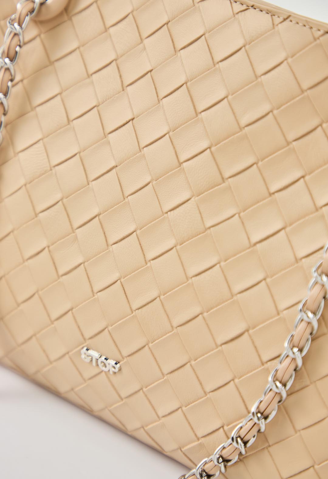 Bolso efecto tejido, color beige y con cadena.