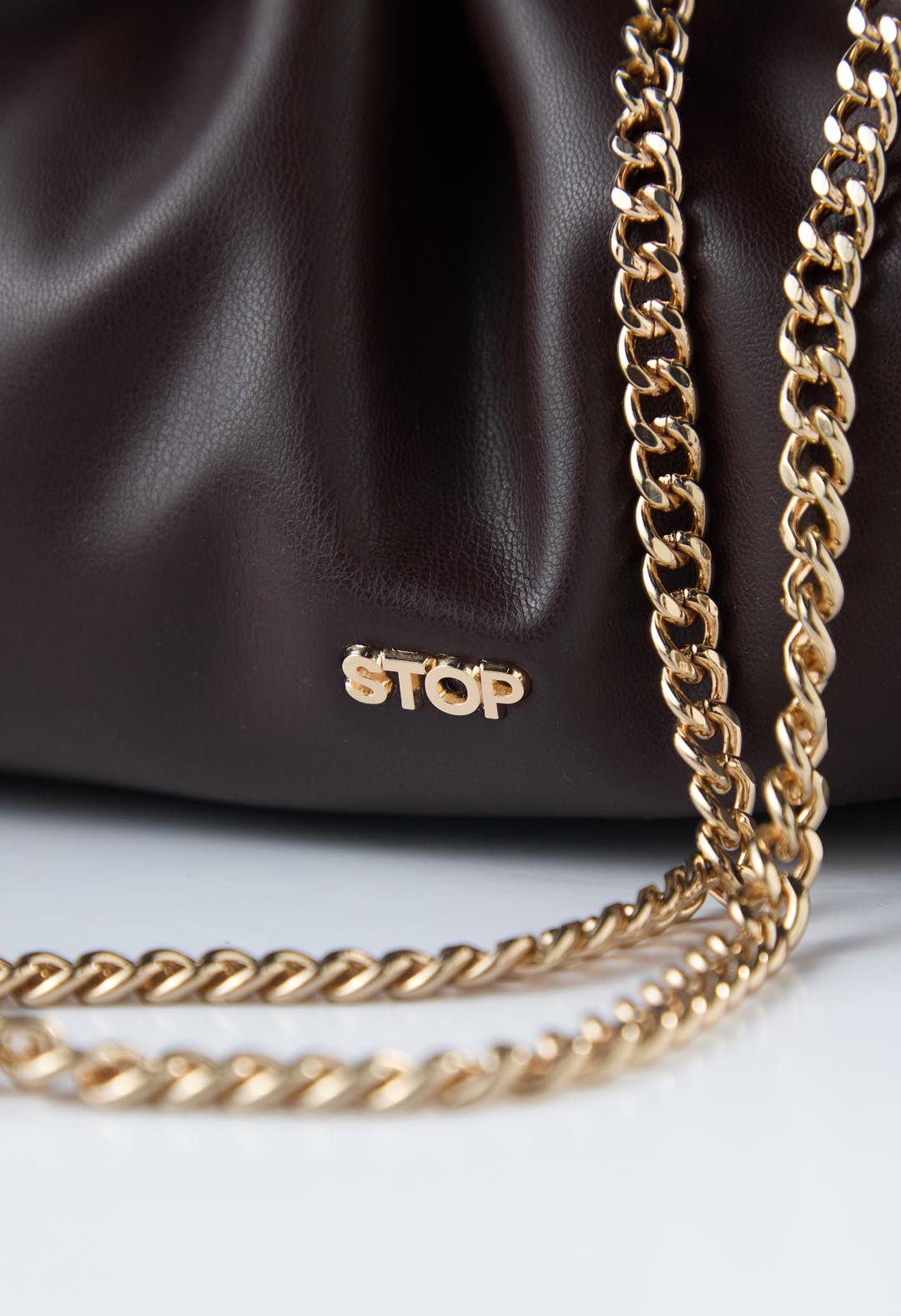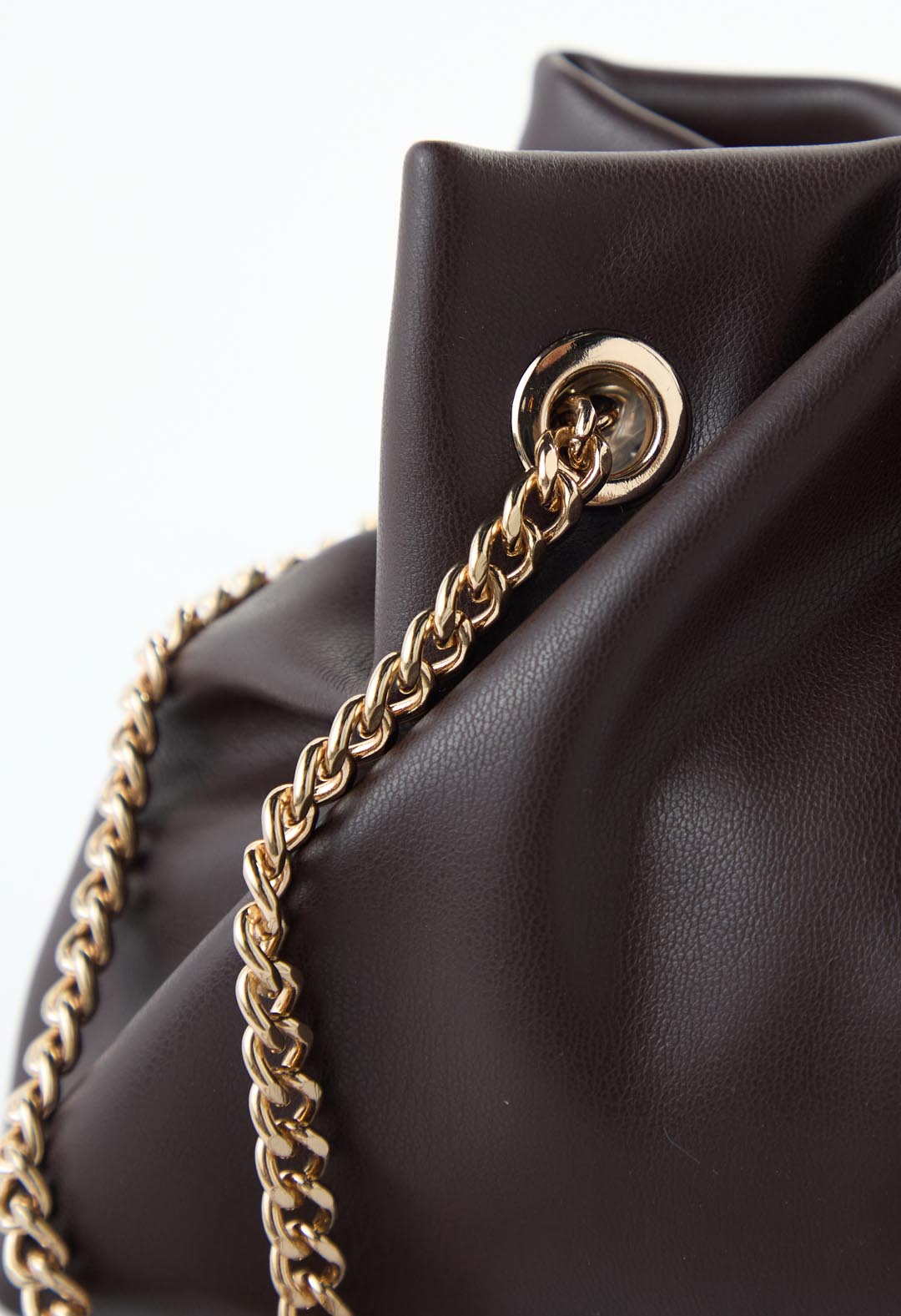 Bolso color chocolate, con recogido y cadena.