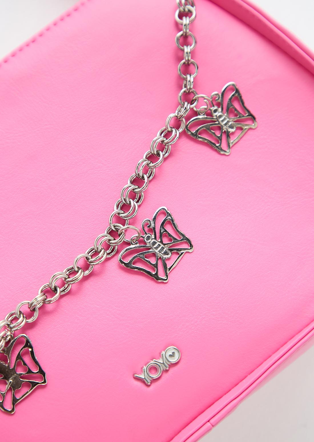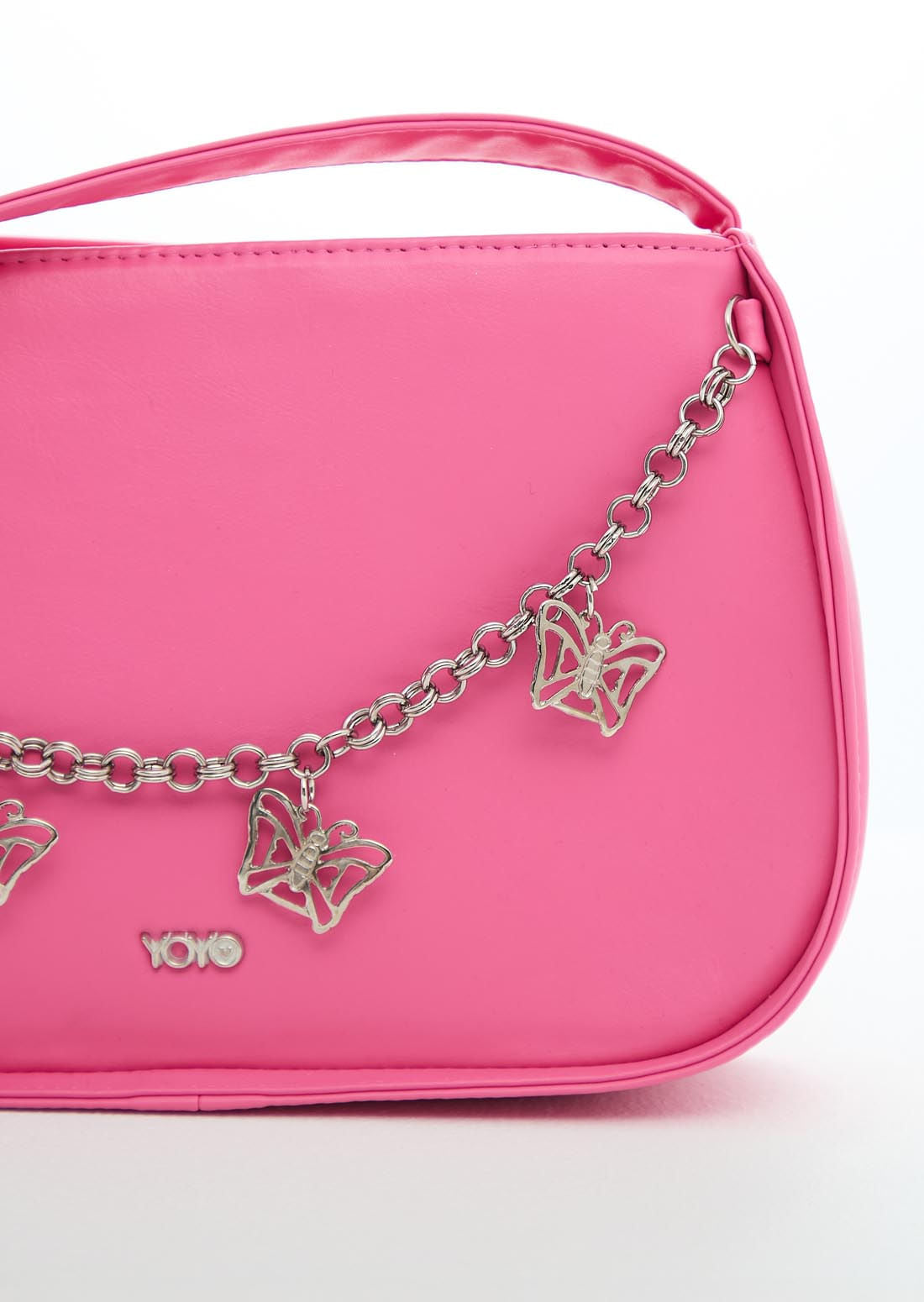 Bolso pequeño, color rosa, cadena y dijes decorativos para adolescentes.