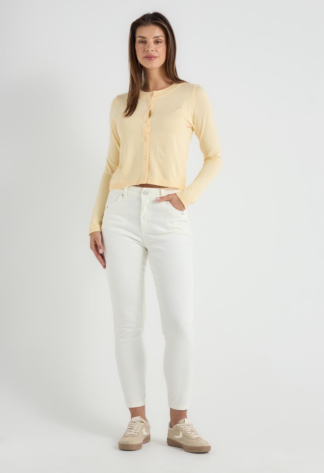 Cárdigan y top amarillo pastel tejido para mujeres