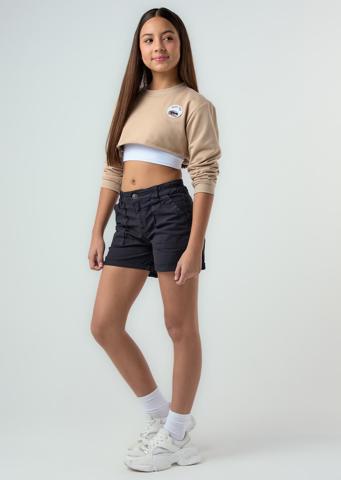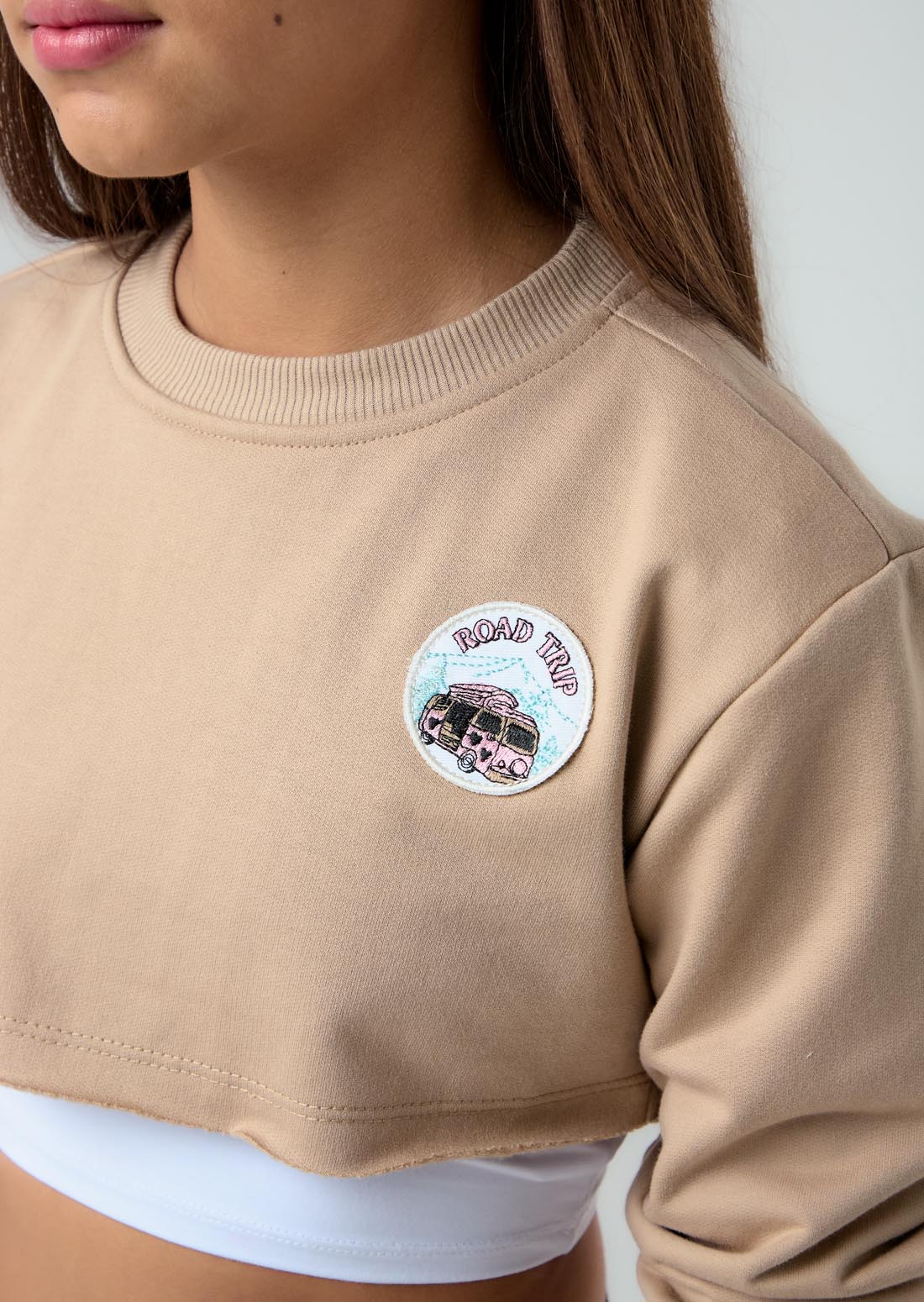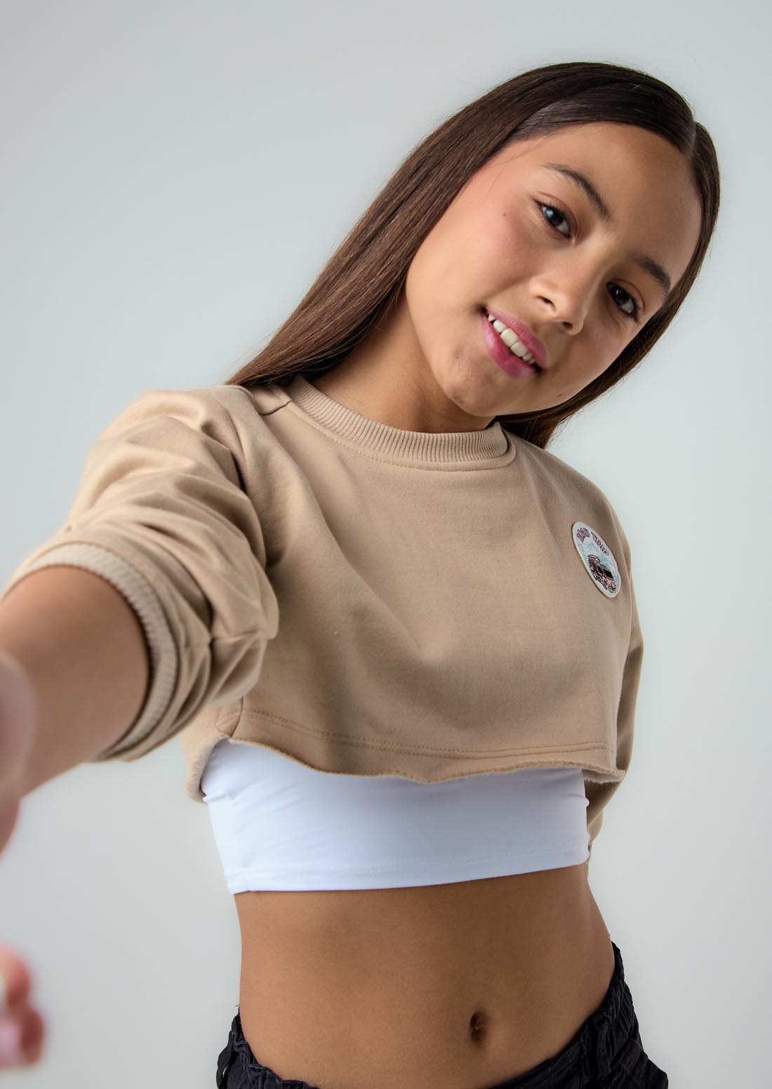 Buzo manga larga, color arena, bordado enfrente y largo crop para niñas.