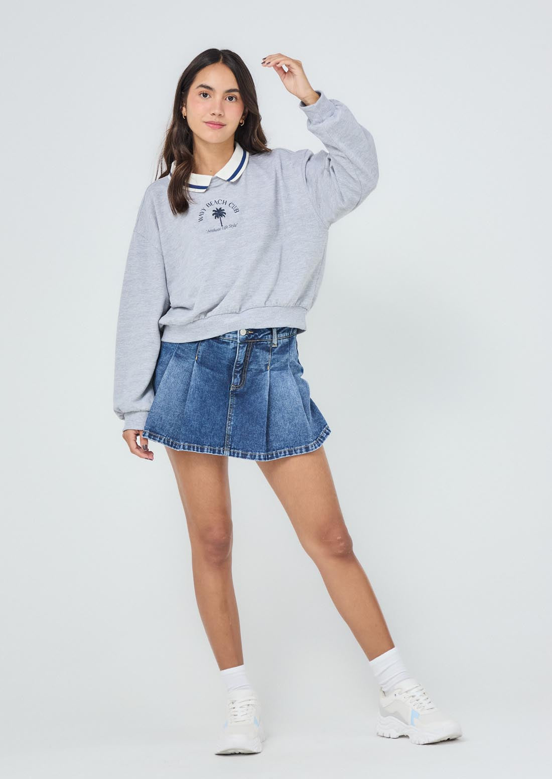 Buzo manga larga, color gris, bordado en frente y cuello en rectilíneo para jóvenes.