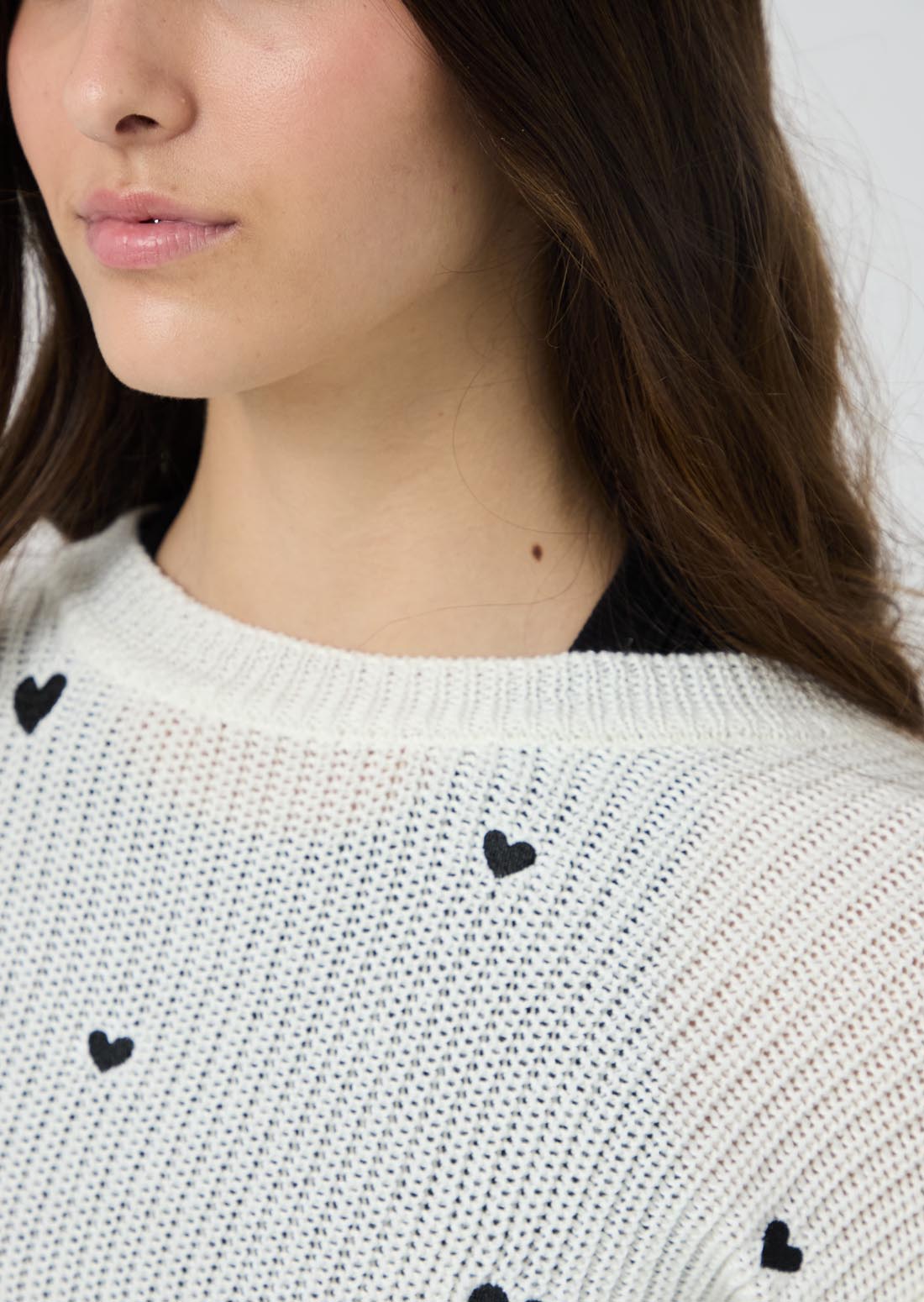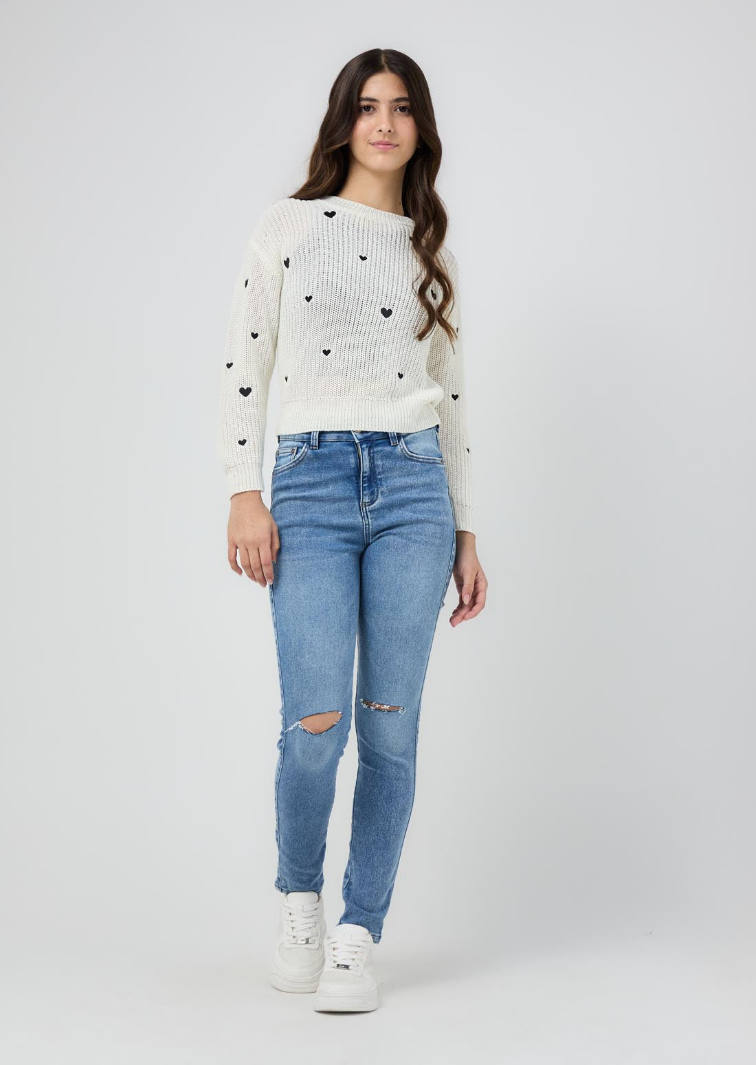 Buzo manga larga, color marfil, tejido y bordado con corazones para jóvenes.