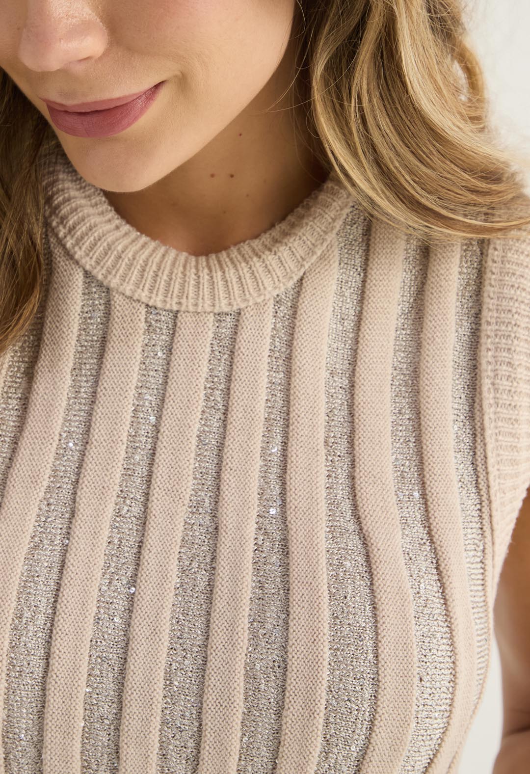 Camiseta a rayas, manga sisa, color arena y brillo para mujer.