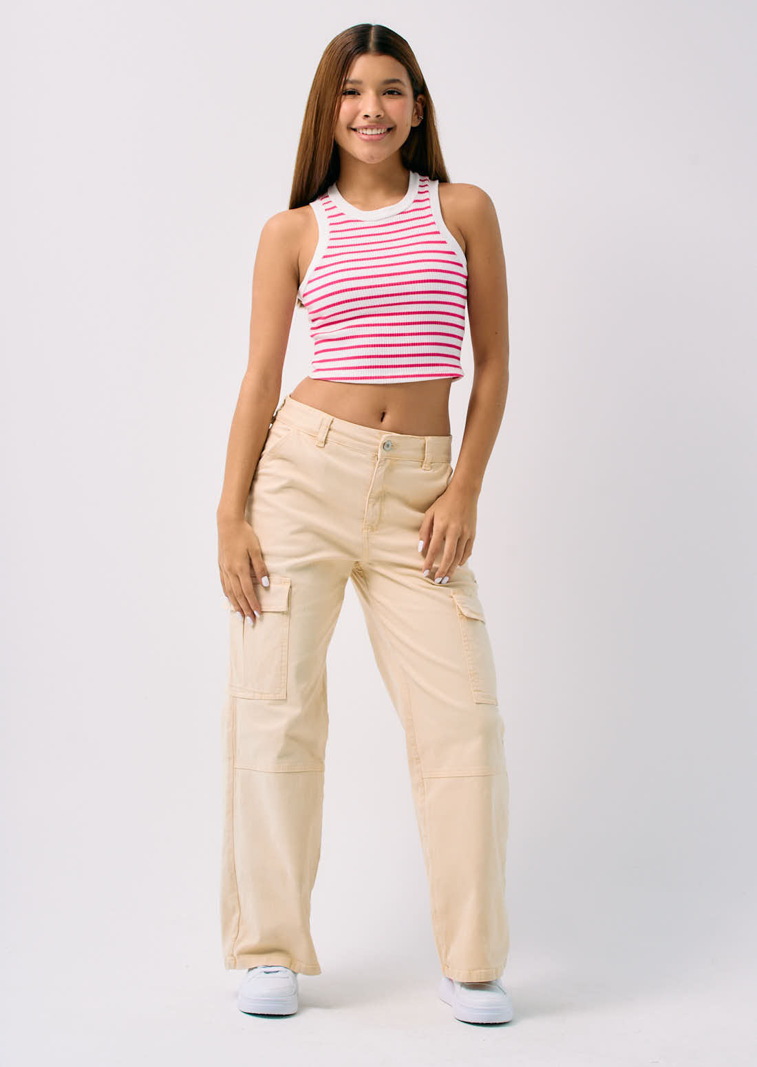 Camiseta a rayas, manga sisa, color rosa y largo crop para jóvenes.