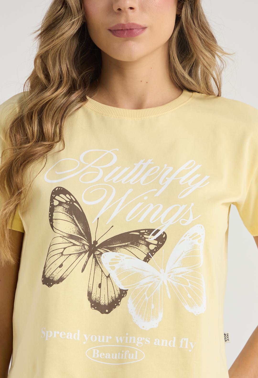 Camiseta manga corta, color amarillo pastel1 y estampado en frente para mujeres.