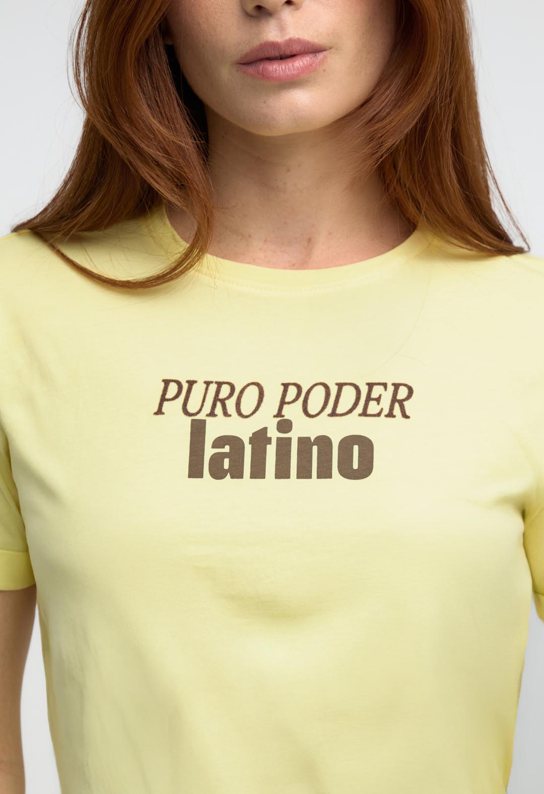 Camiseta manga corta, color amarillo pastel, cuello redondo, guardapolvo en manga, largo hasta pretina, estampado en frente y espalda para mujeres.