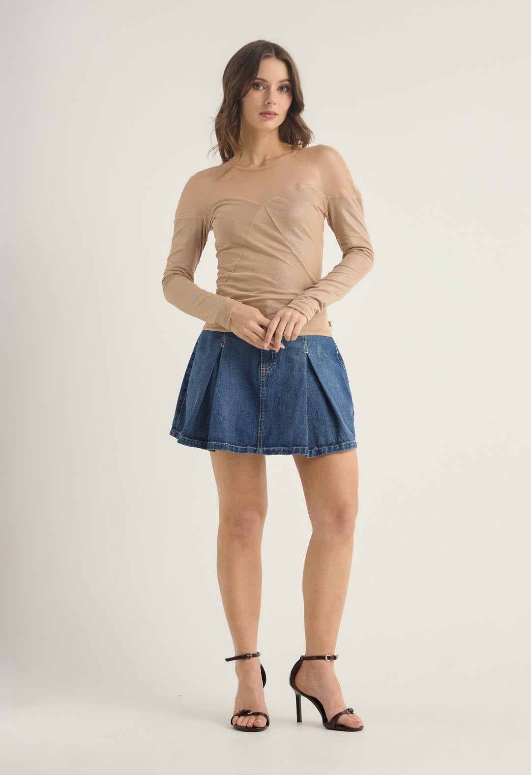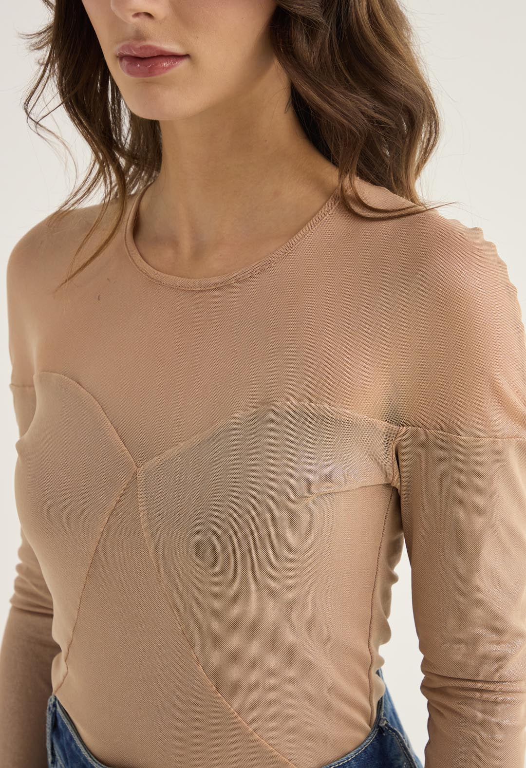 Camiseta manga larga, color arena, cortes en frente y fondo entero para mujer.