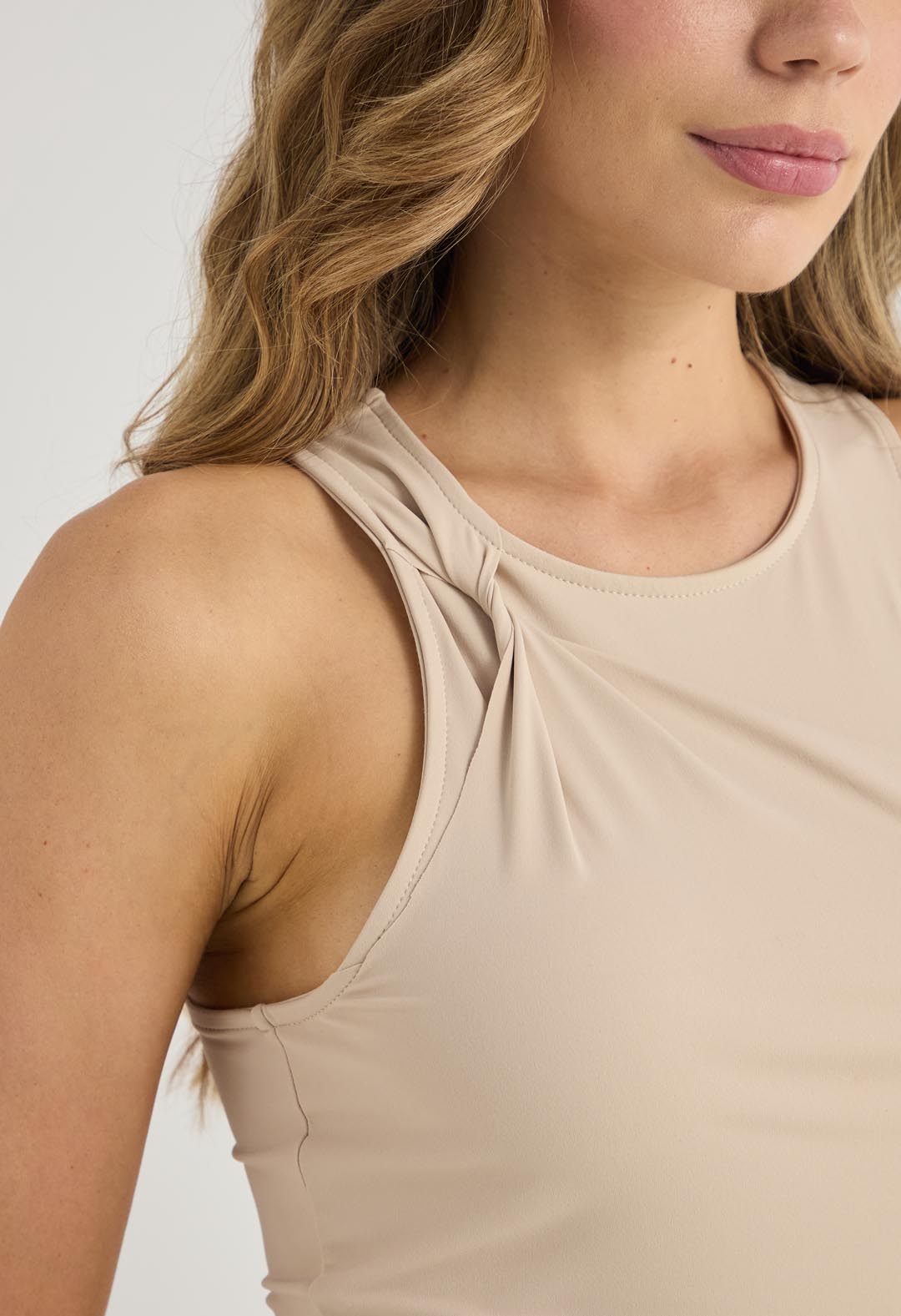 Camiseta manga sisa, color arena, con entorchado en hombro y fondo entero para mujer.