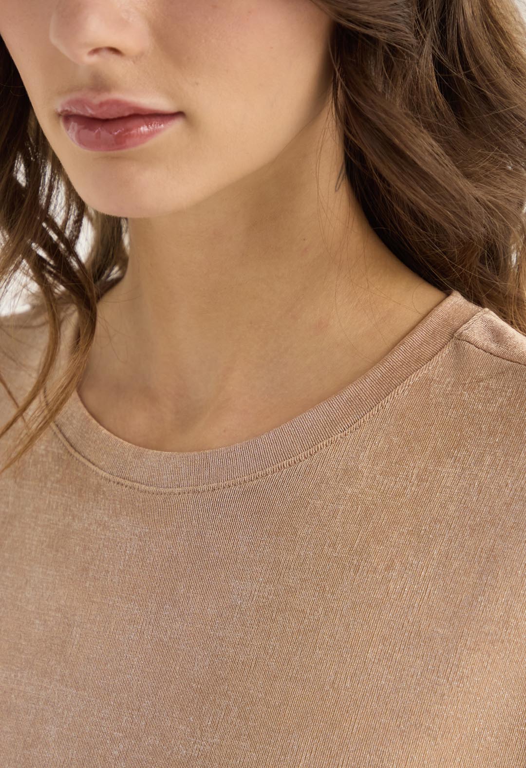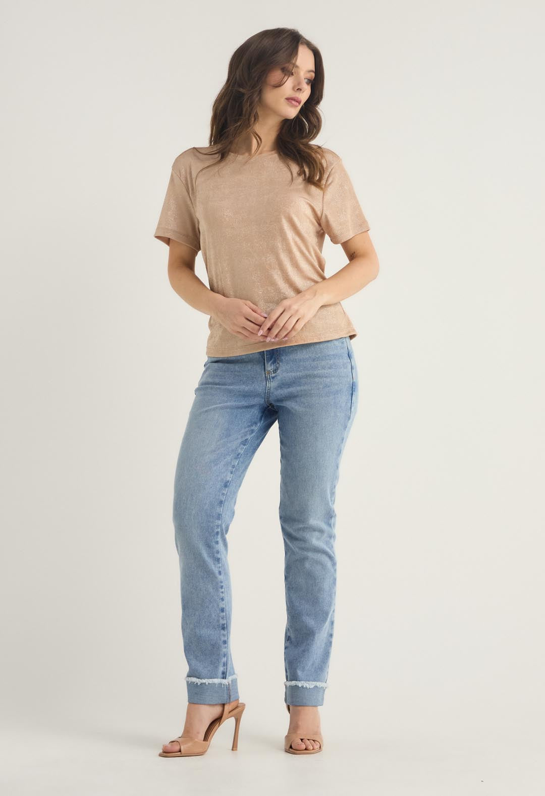 Camiseta manga corta, color arena, cuello redondo y tela brillante para mujer.