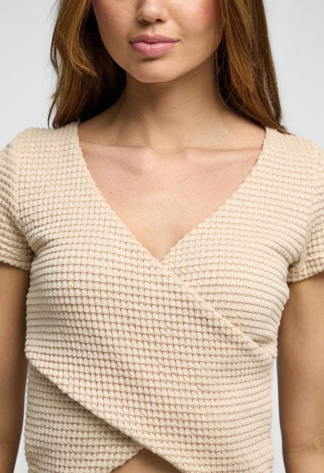 Camiseta manga corta, color arena, cruzada en frente y tela con efecto para mujeres.