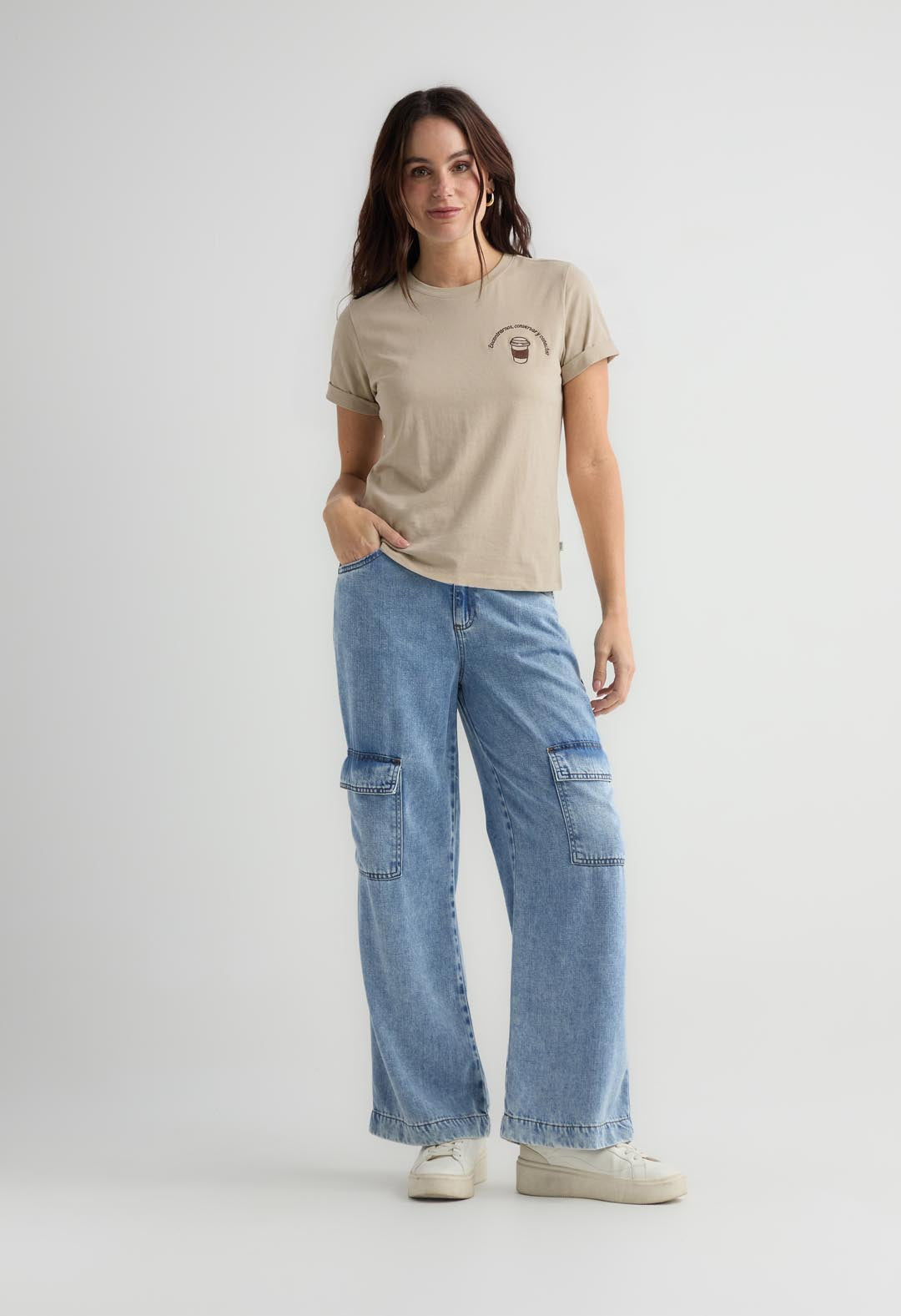 Camiseta de manga corta, color arena, estampada y cuello redondo para mujer.