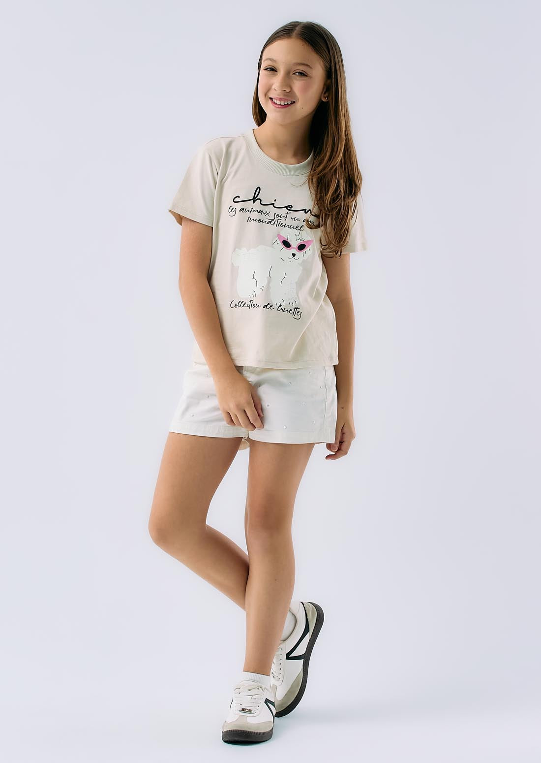 Camiseta manga corta, color arena, largo hasta pretina y estampado en frente para niñas.