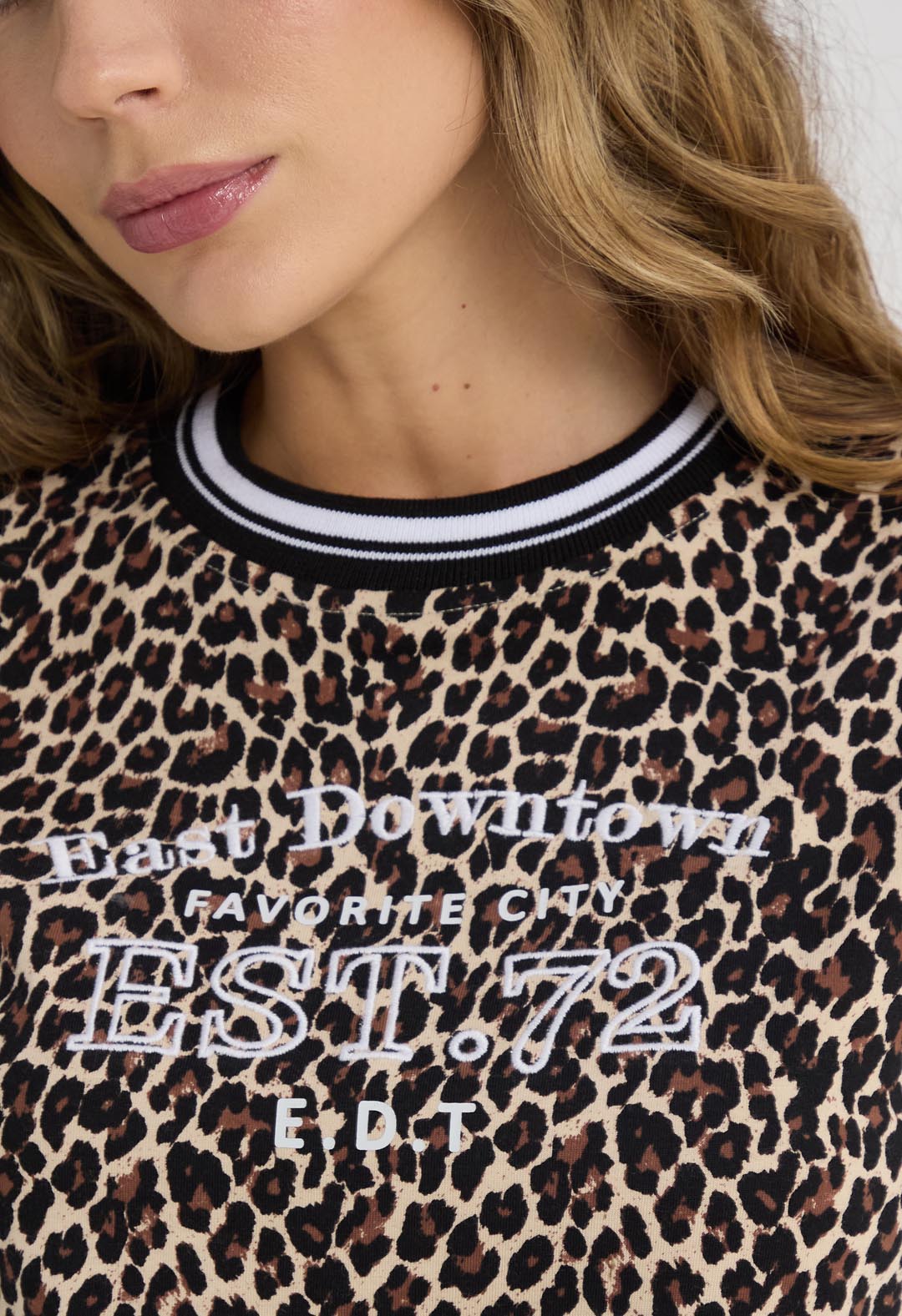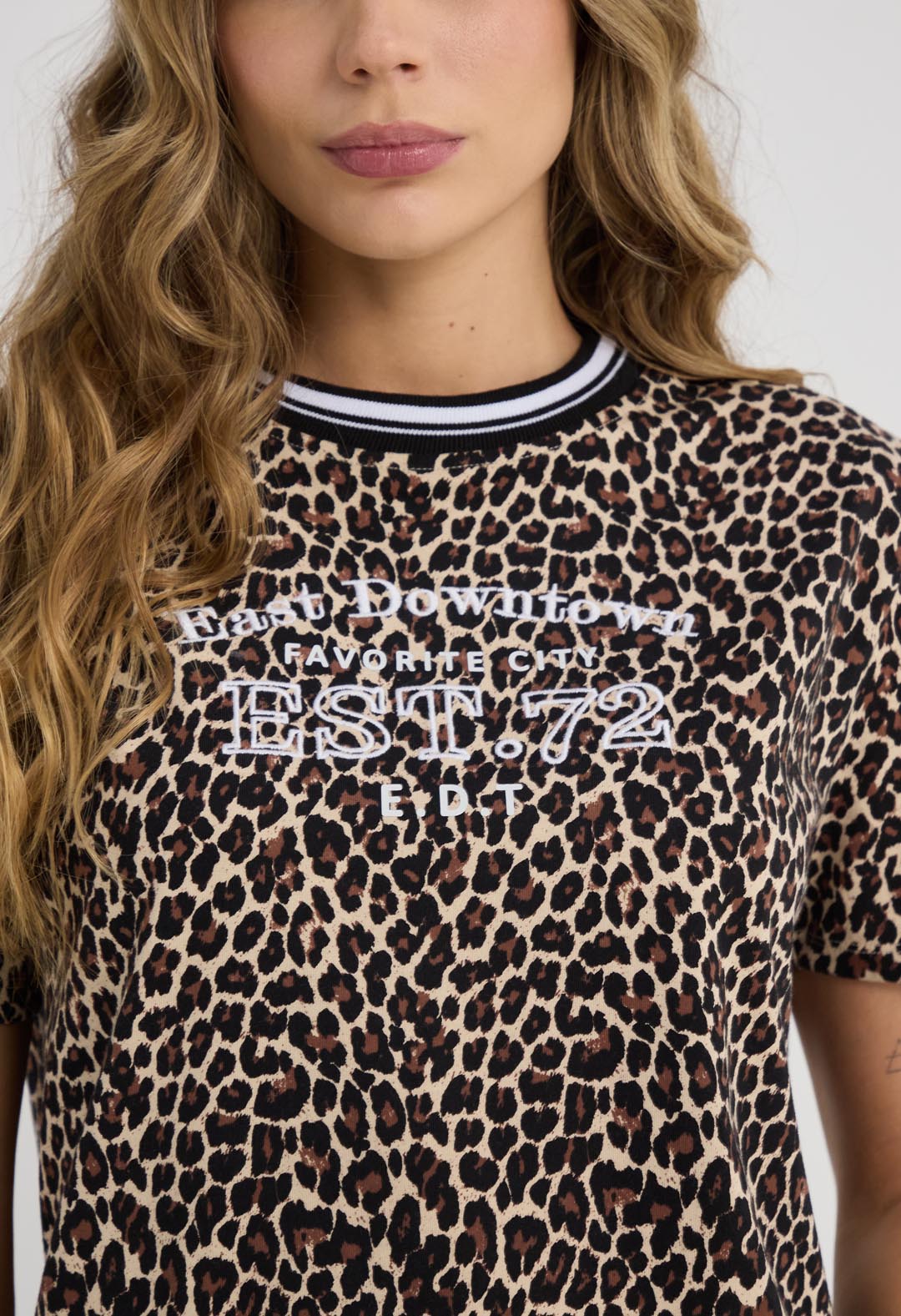 Camiseta manga corta, color arena, full print y rectilíneo para mujeres.