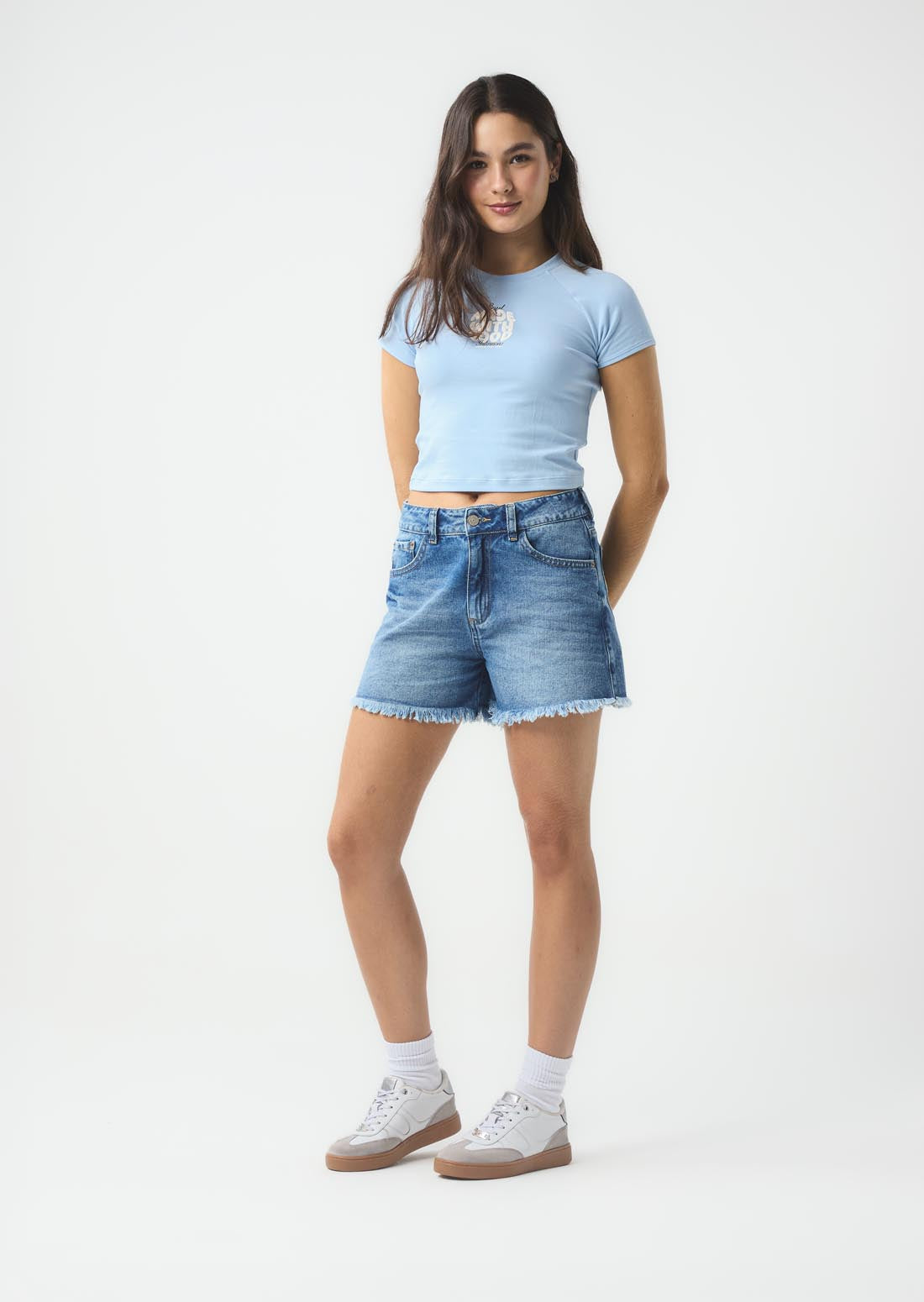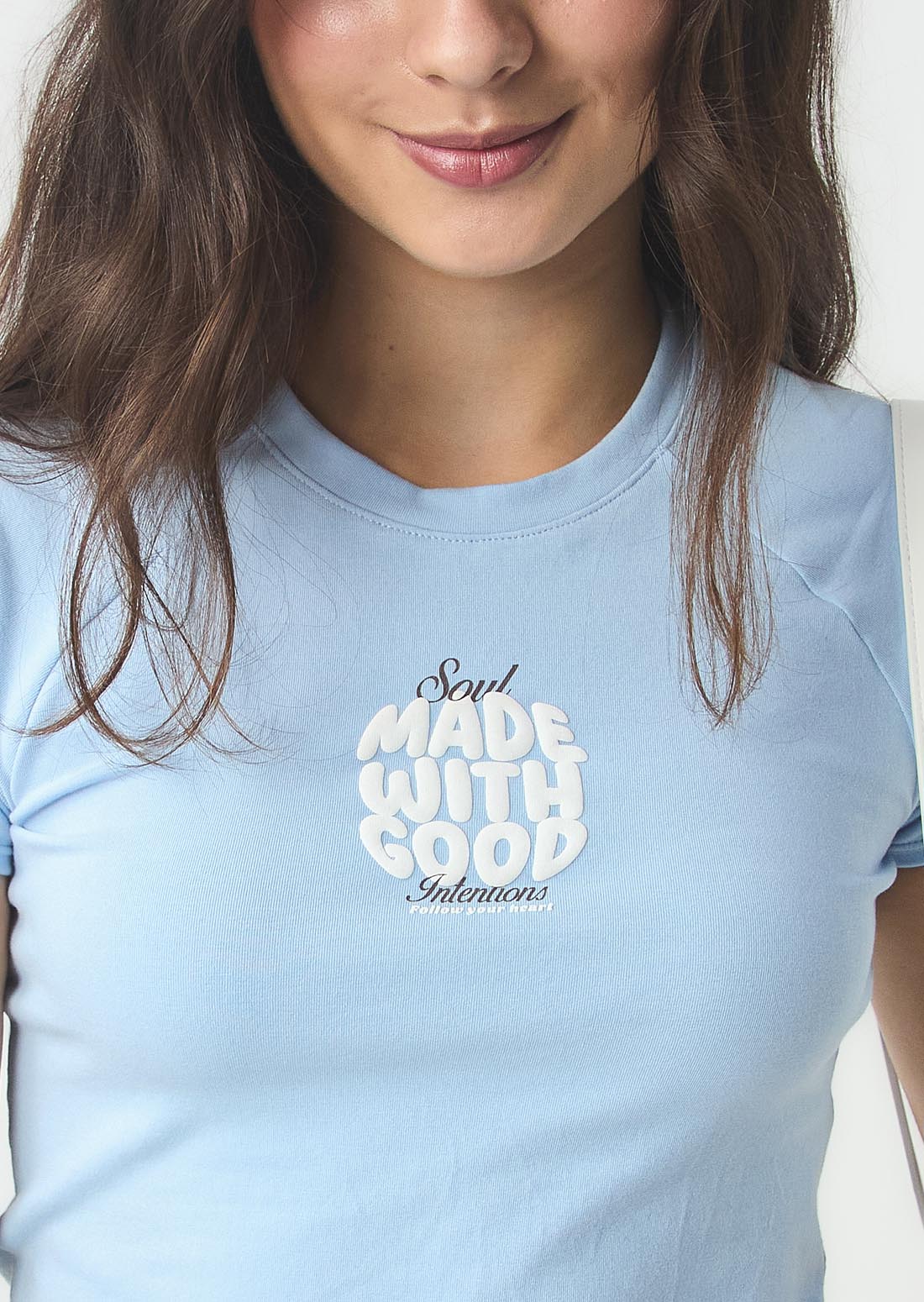 Camiseta color azul claro, cuello redondo, con estampado en frente, manga corta y ranglán para jóvenes.