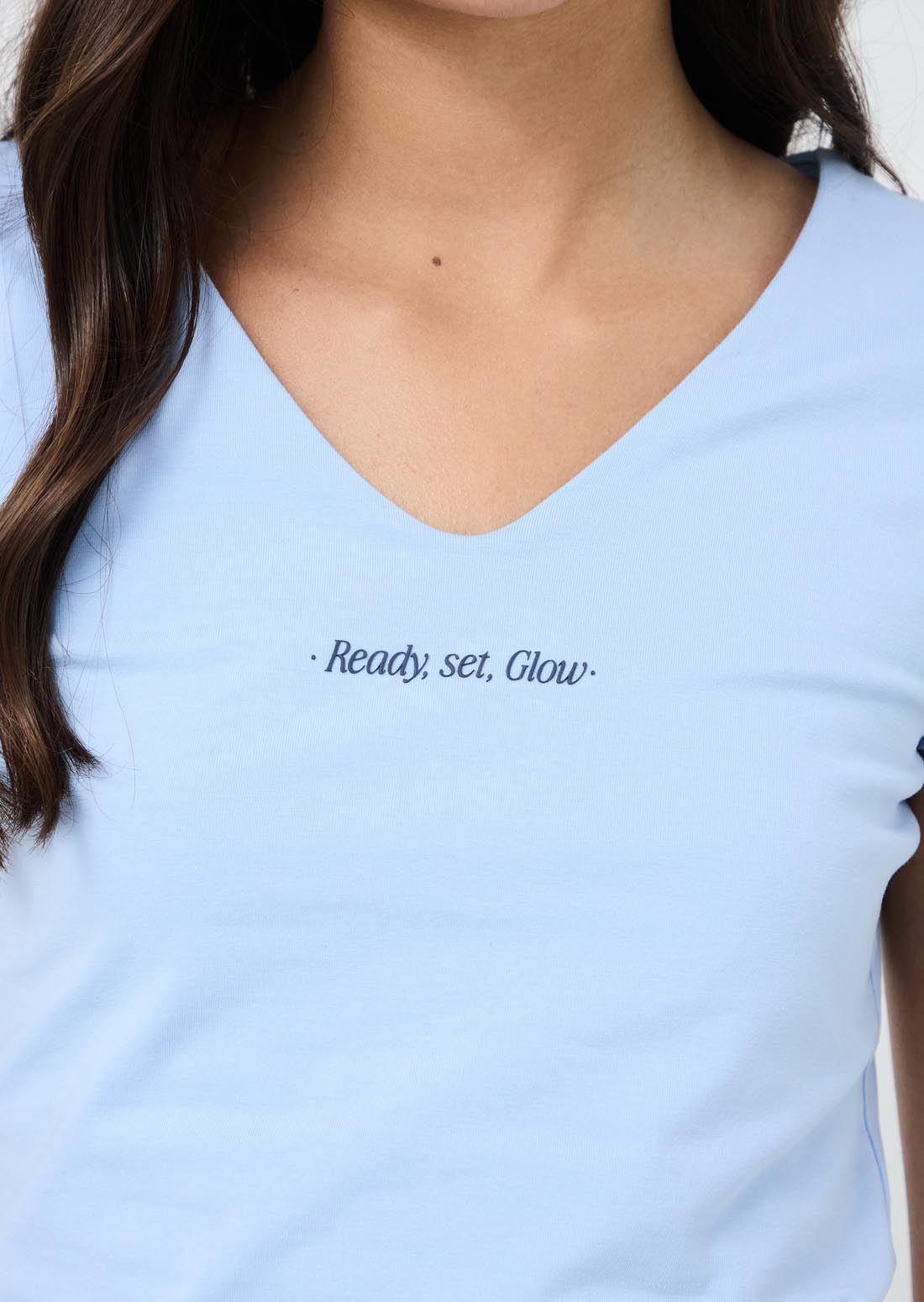 Camiseta manga corta, color azul claro, escoter en V y estampado en frente para jóvenes.