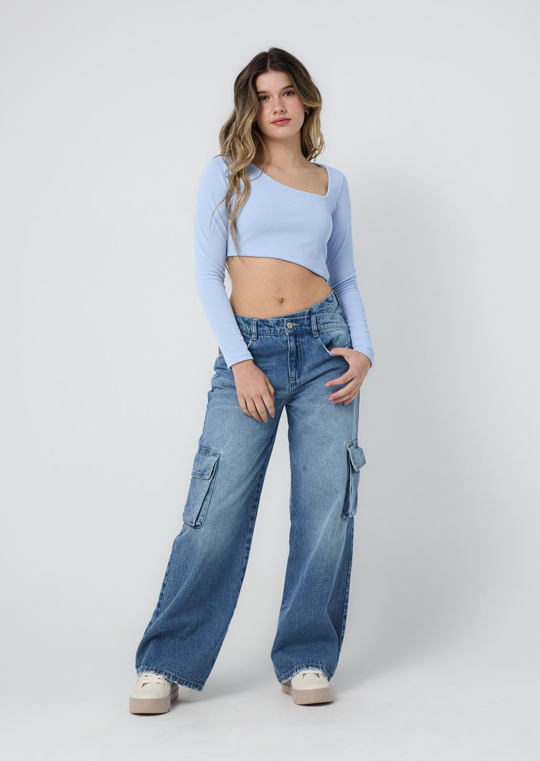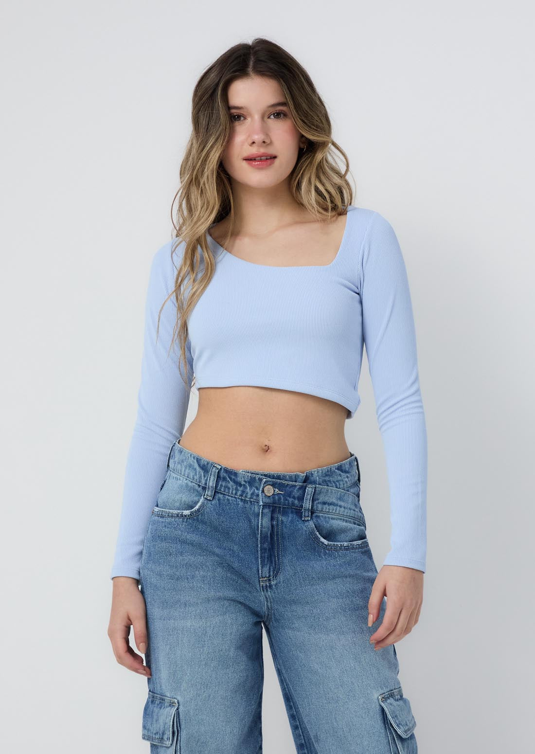 Camiseta manga larga, color azul claro, asimetrico y fondo entero para jóvenes.