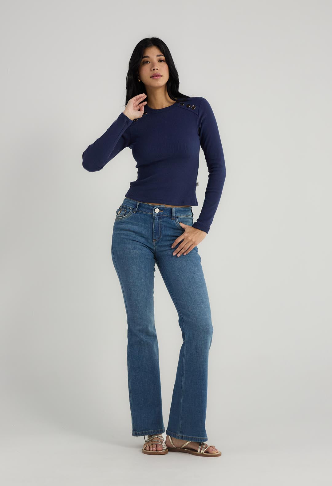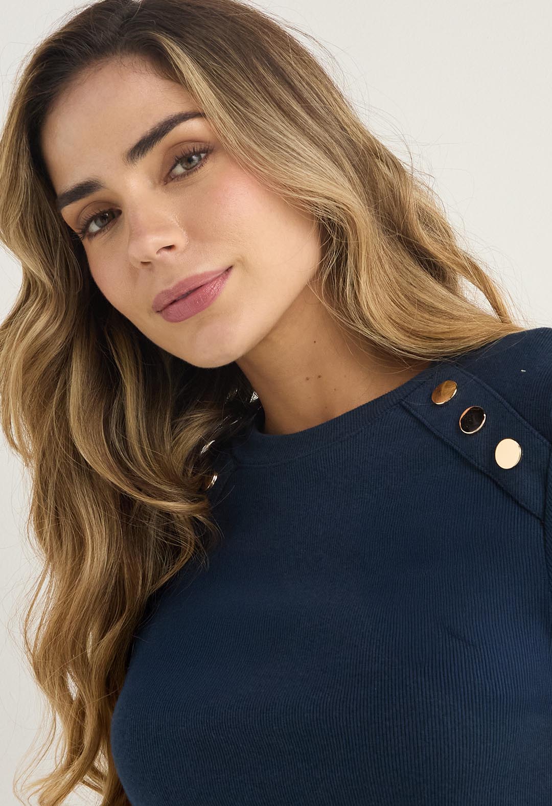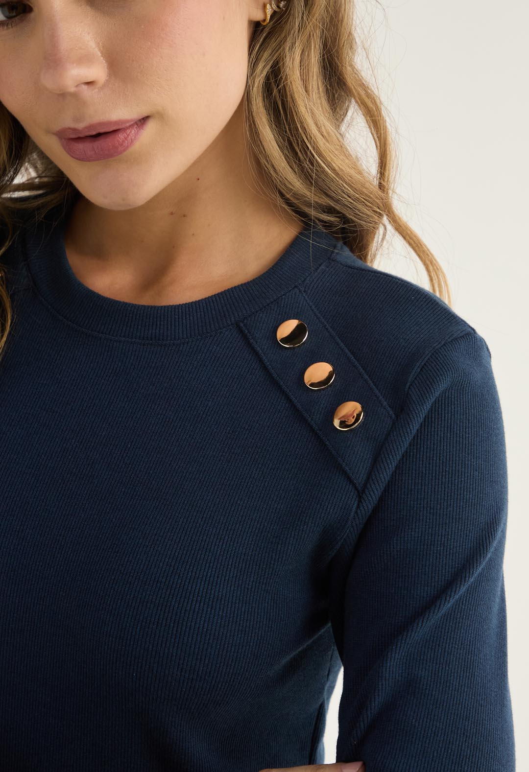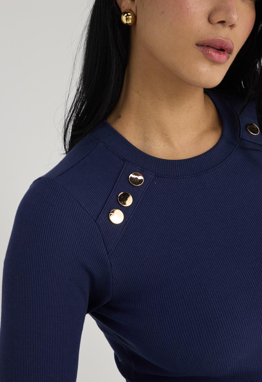 Camiseta manga larga, color azul navy y con broches decorativos para mujer.