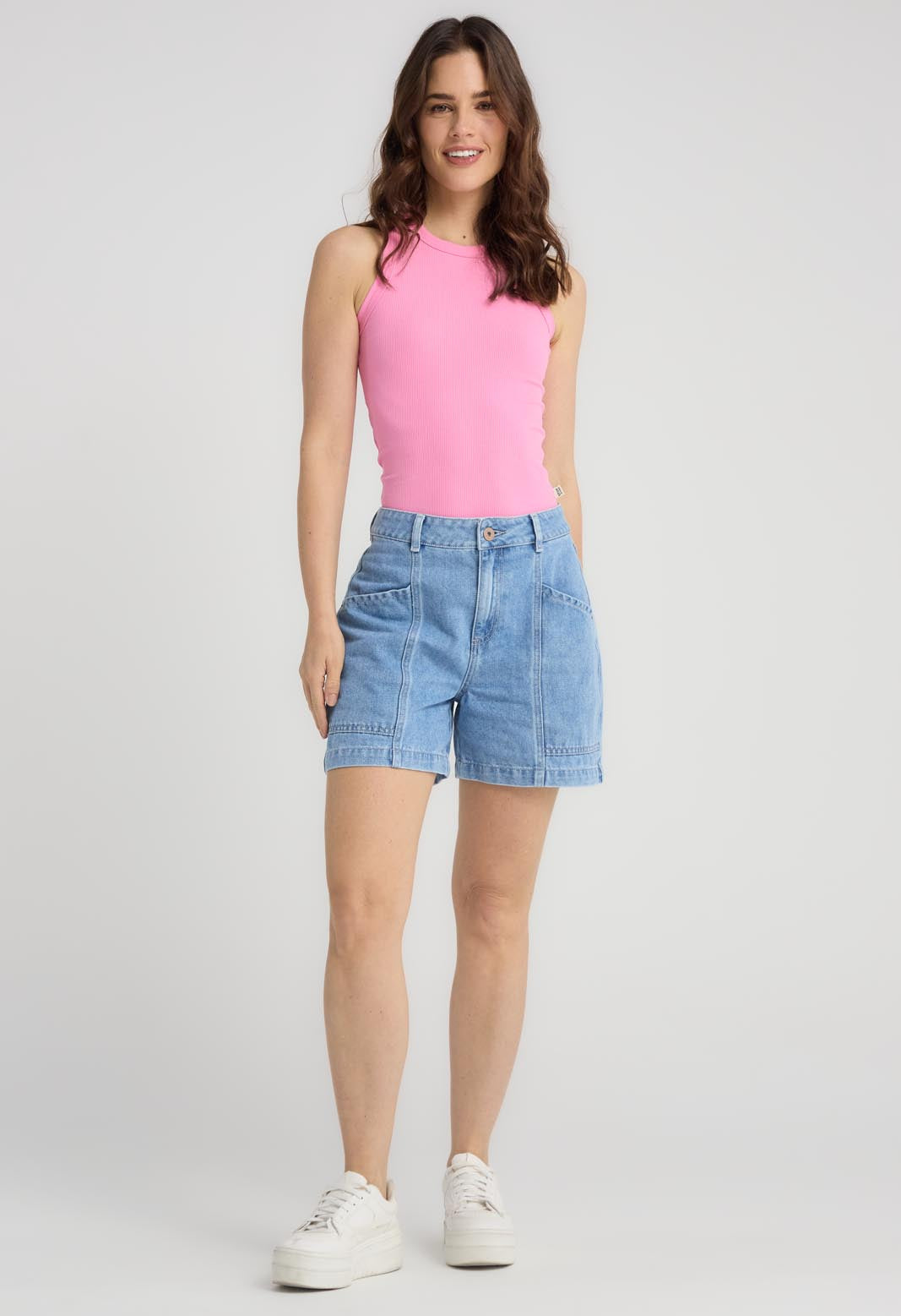 Camiseta manga sisa, color rosa, fondo entero, básica y en rib para mujeres.
