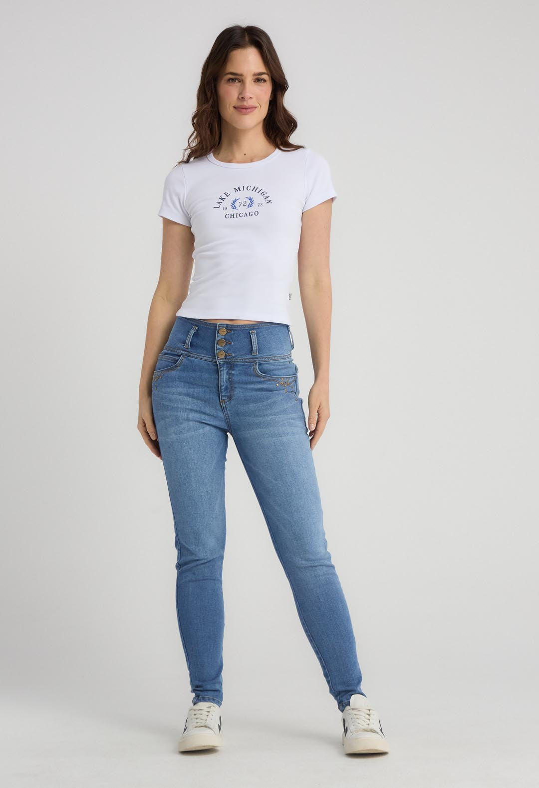 Camiseta manga corta, color blanco, cuello redondo y estampado para mujer.