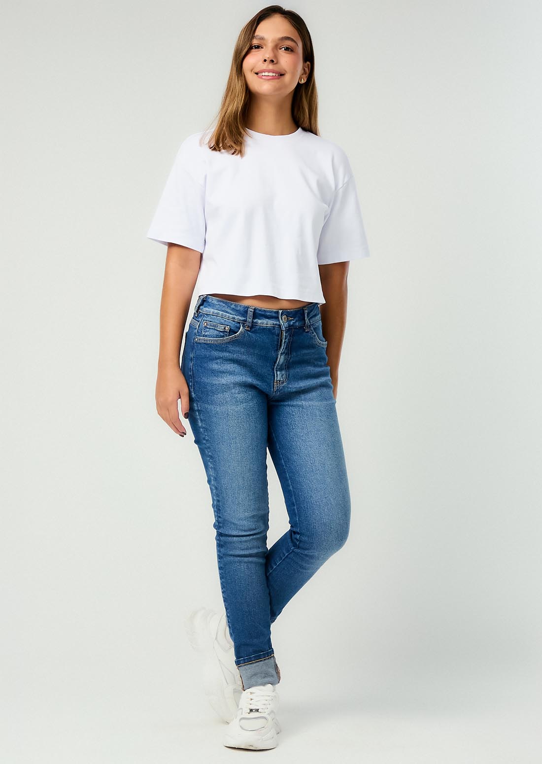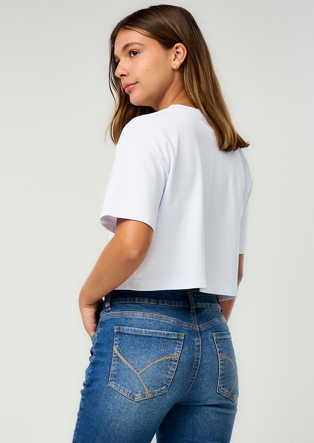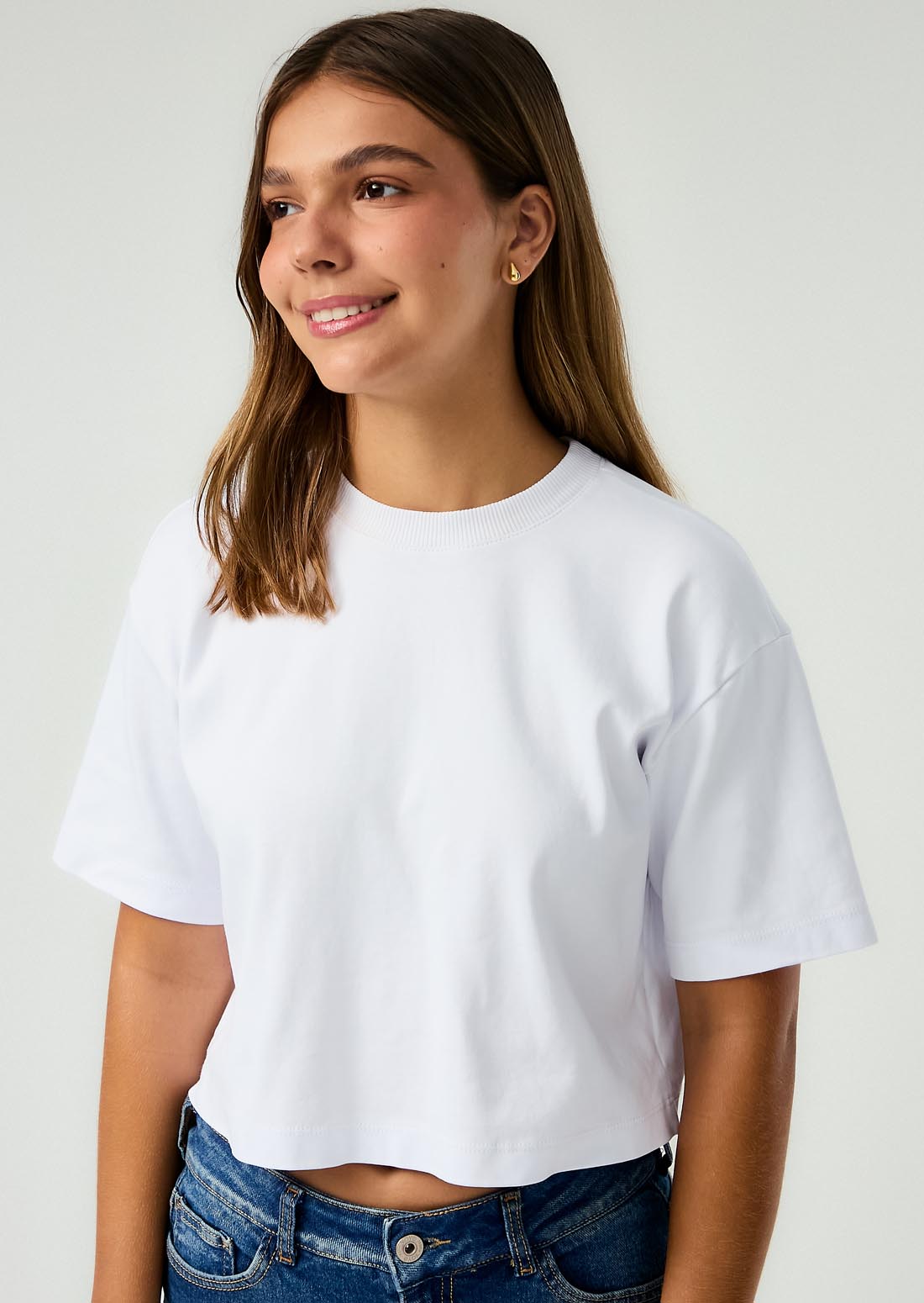 Camiseta manga corta, color blanco, fondo entero, cuello redondo y largo sobre pretina para jóvenes.