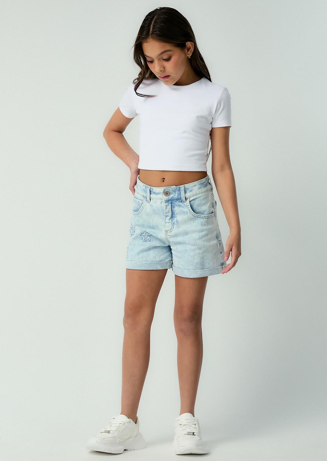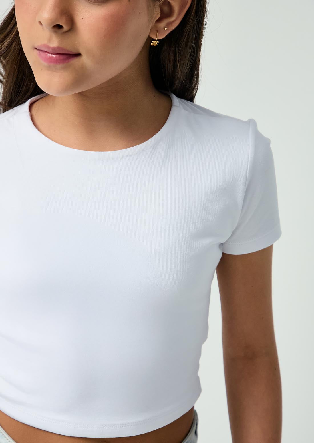 Camiseta manga corta, color blanco, cuello redondo, fondo entero y largo crop para niñas.