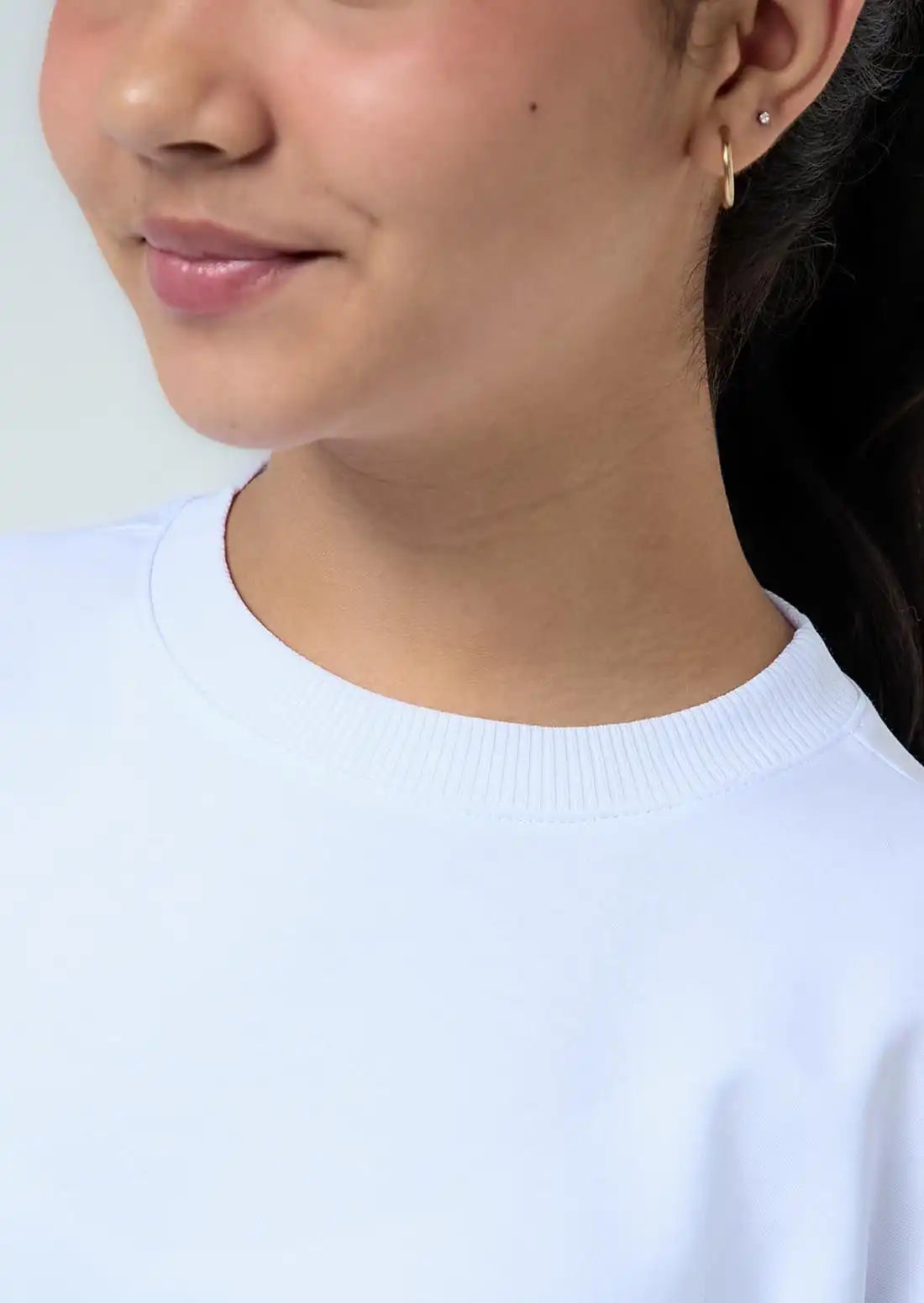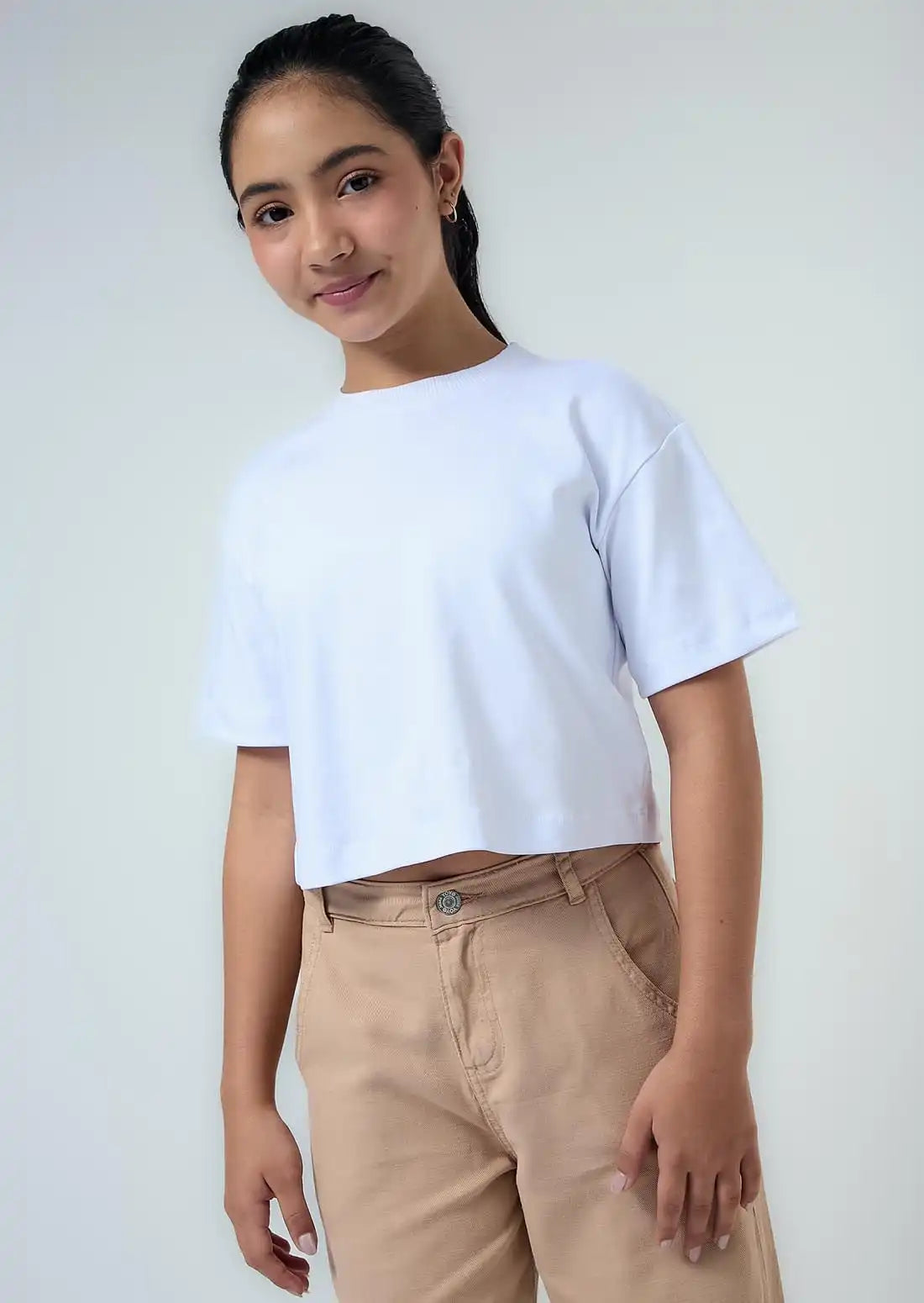 Camiseta manga sisa, color blanco, cuello redondo, fondo entero y largo crop para niñas.