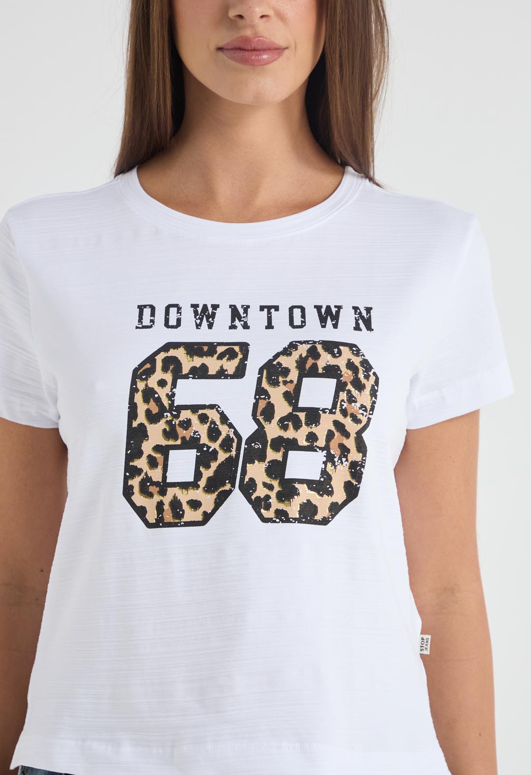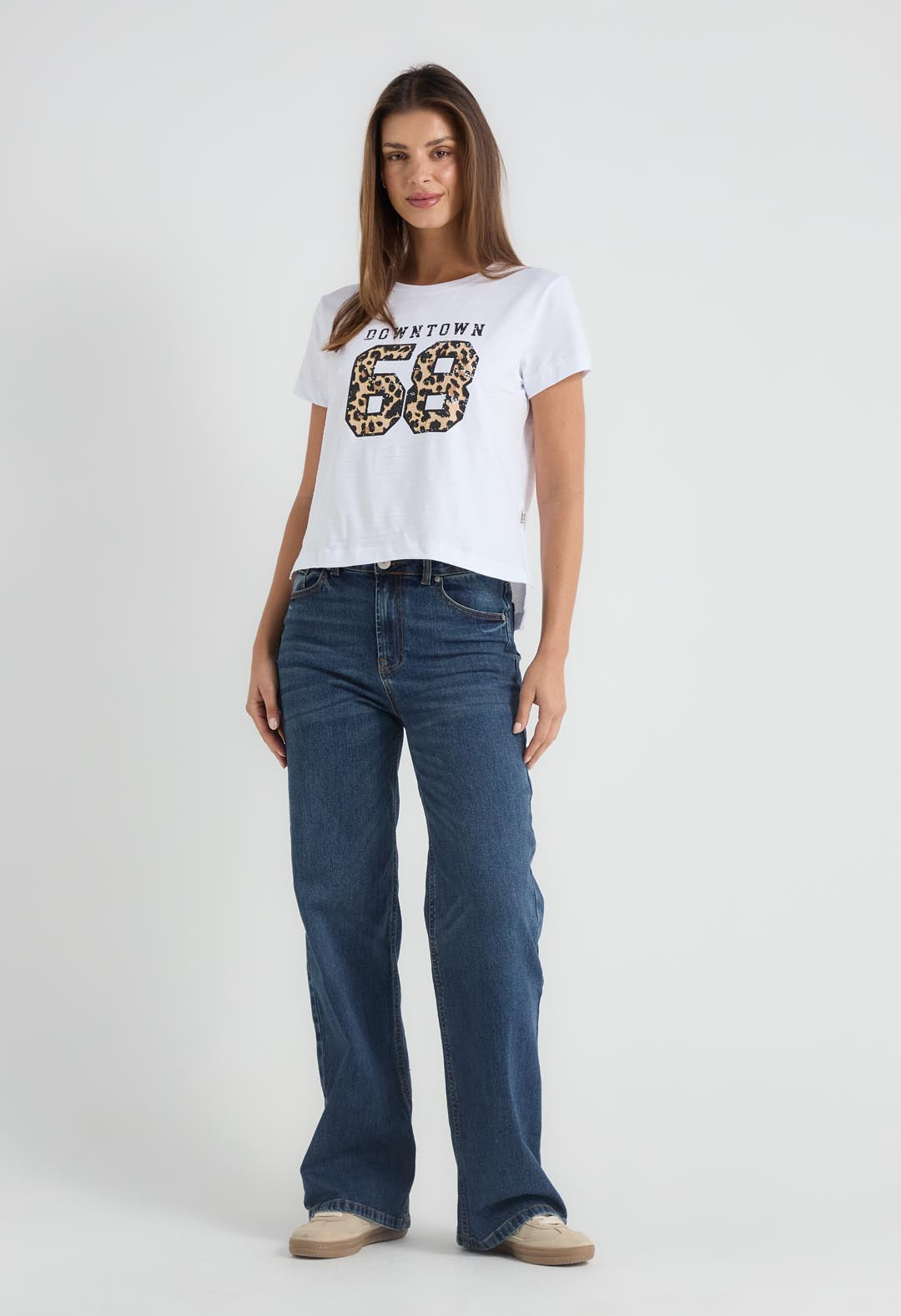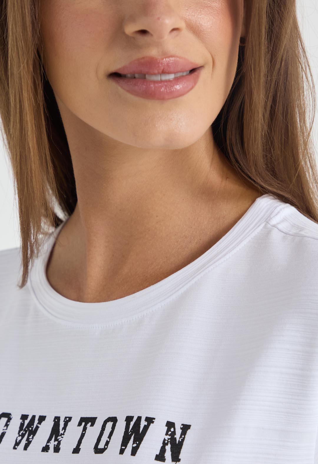 Camiseta manga corta, color blanco, abertura en ruedo en costados y fondo entero para mujeres.