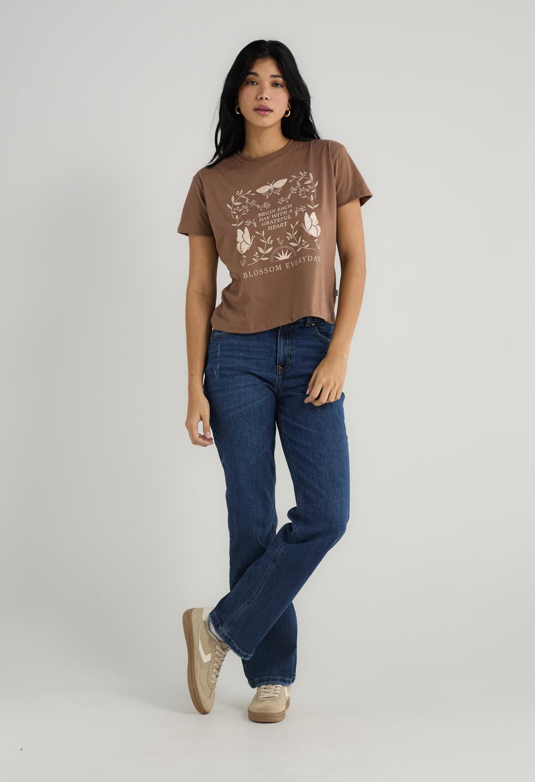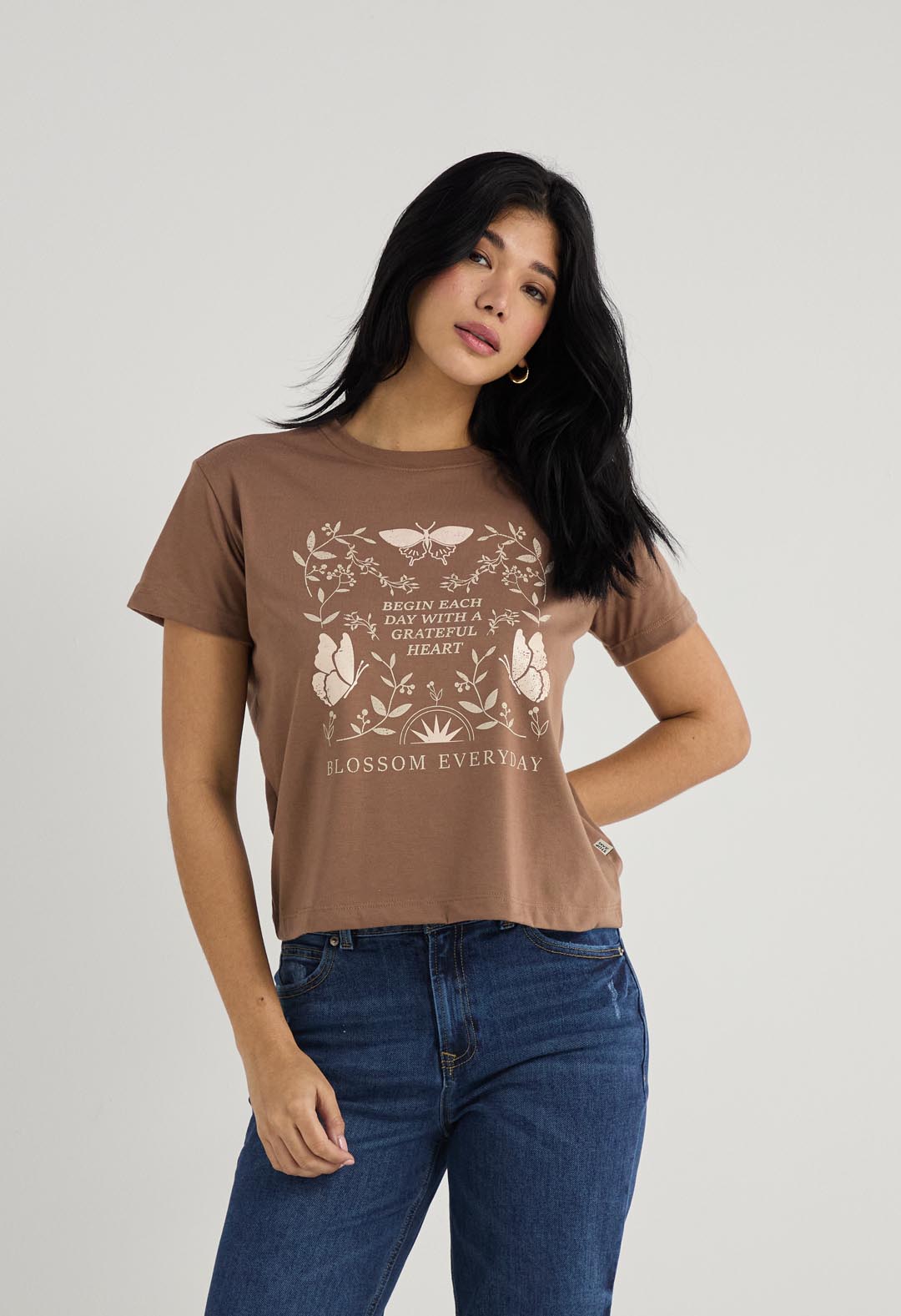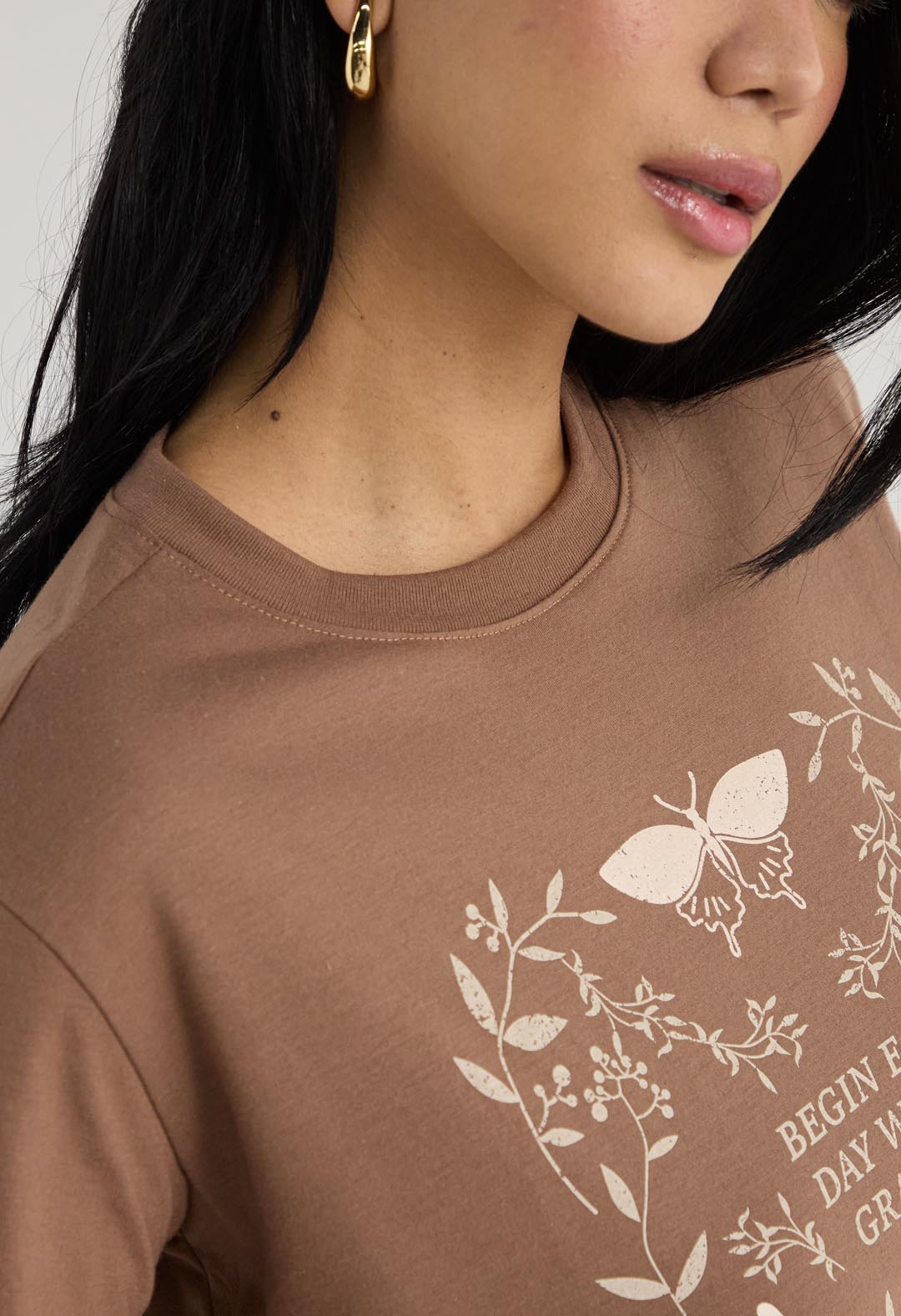 Camiseta manga corta, color chocolate, cuello redondo y estampada para mujer.