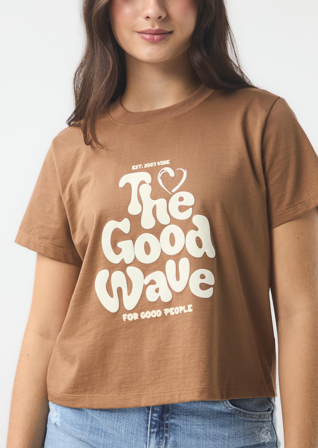 Camiseta de manga corta, color chocolate, estampada en frente y cuello redondo para jóvenes.