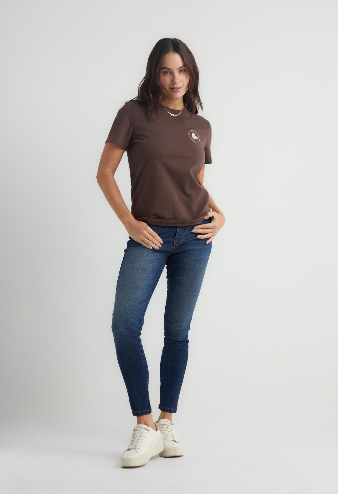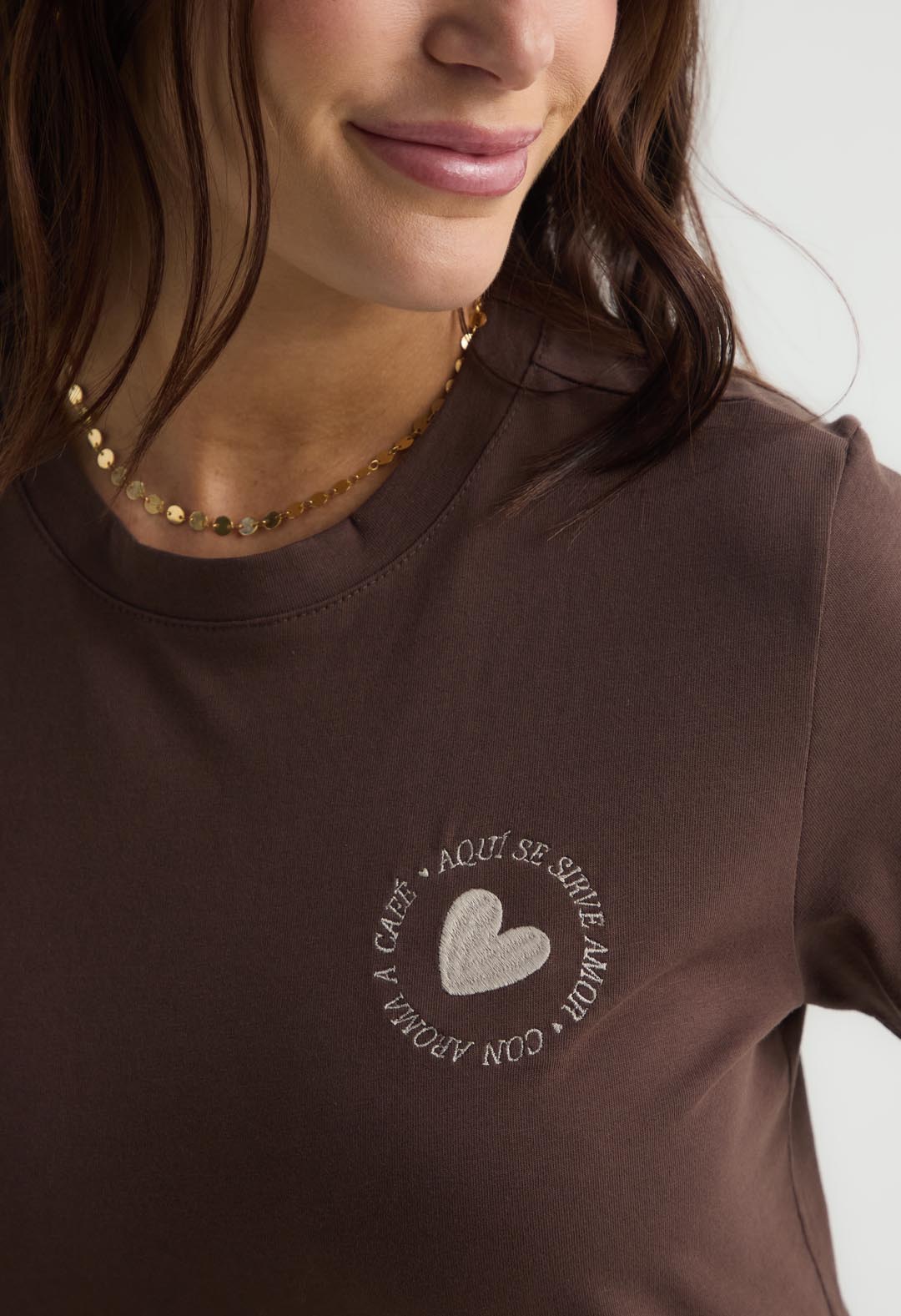 Camiseta de manga corta, color chocolate, estampada y cuello redondo para mujer.