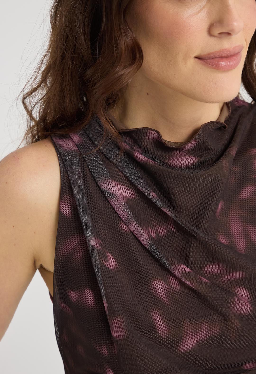 Camiseta manga sisa, color chocolate, en malla y estampada para mujeres.