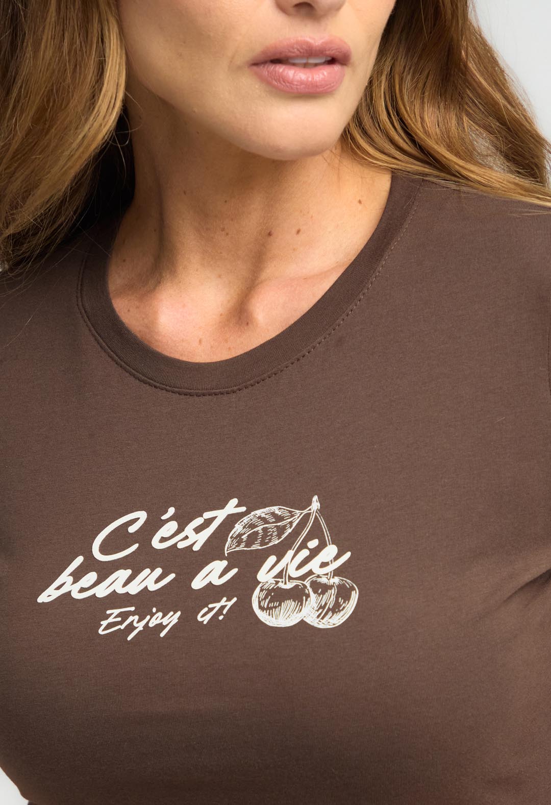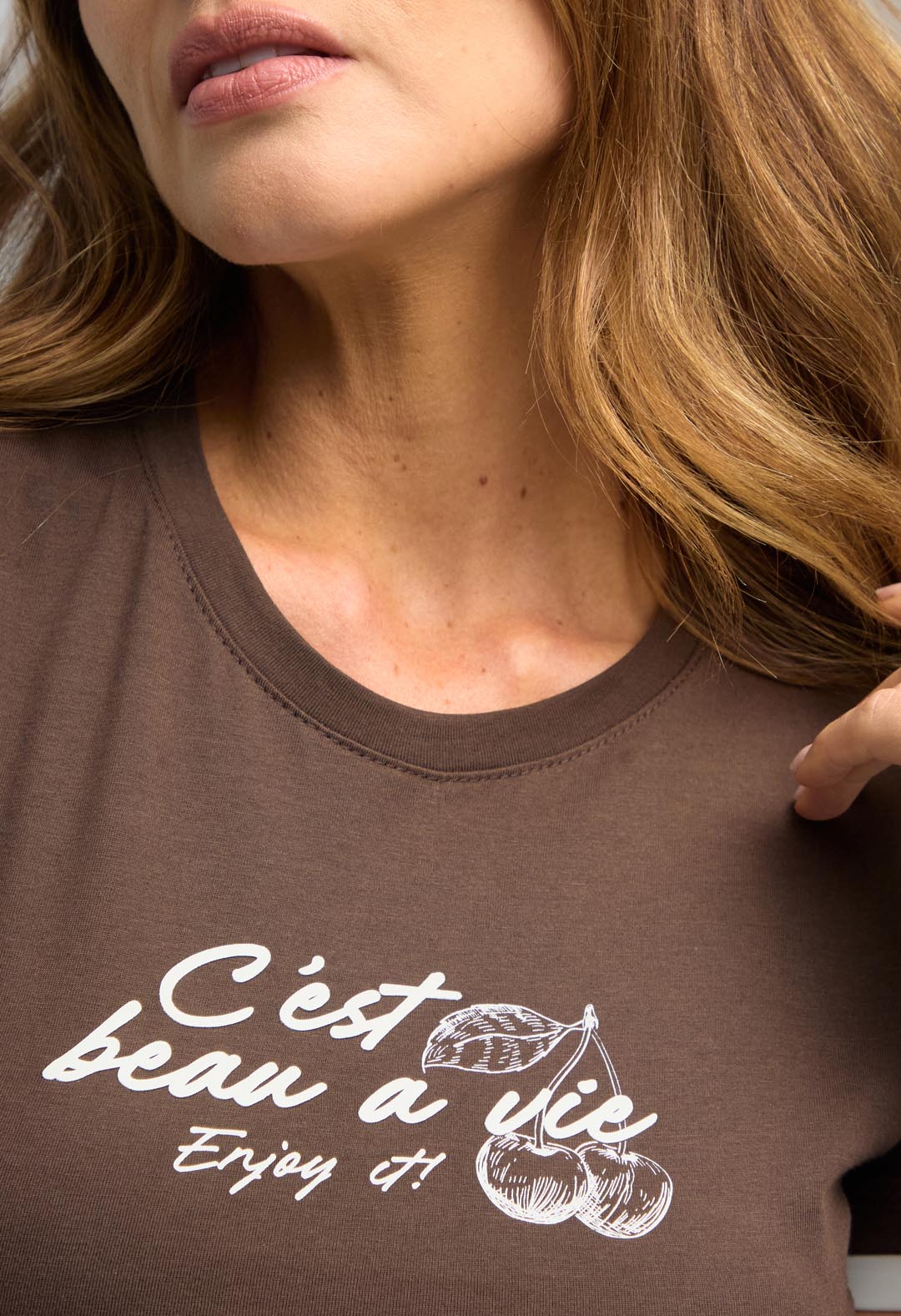 Camiseta manga corta, color chocolate, imitación doble prenda, cuello redondo y fente estampado para mujeres.