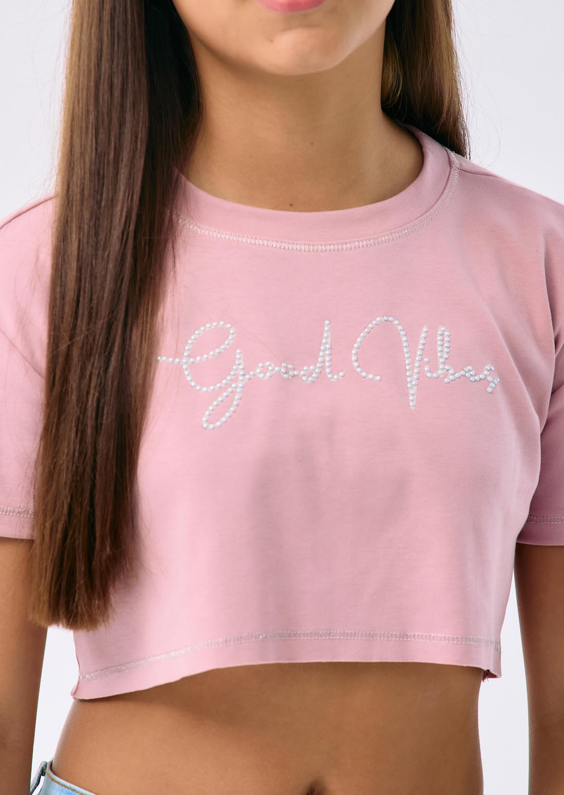 Camiseta manga corta, color mora, frente estampado, largo crop y amplia en costados para niñas.