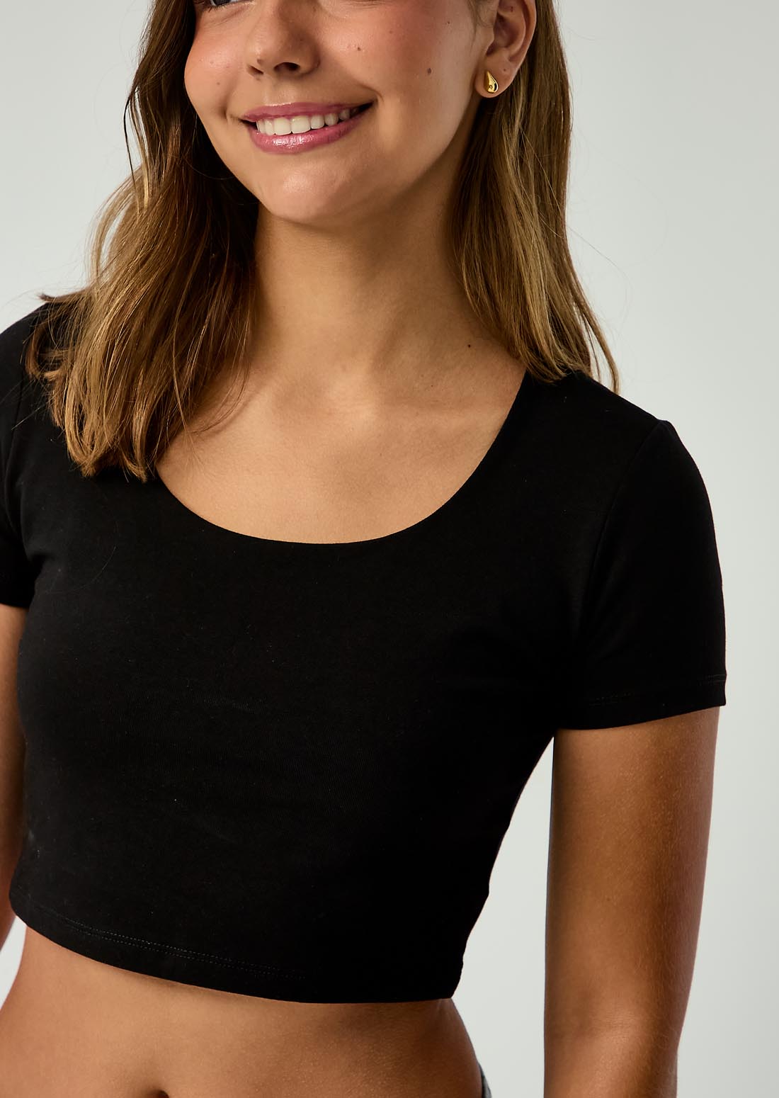 Camiseta manga corta, color negro, fondo entero, largo crop y cuello redondo para jóvenes.