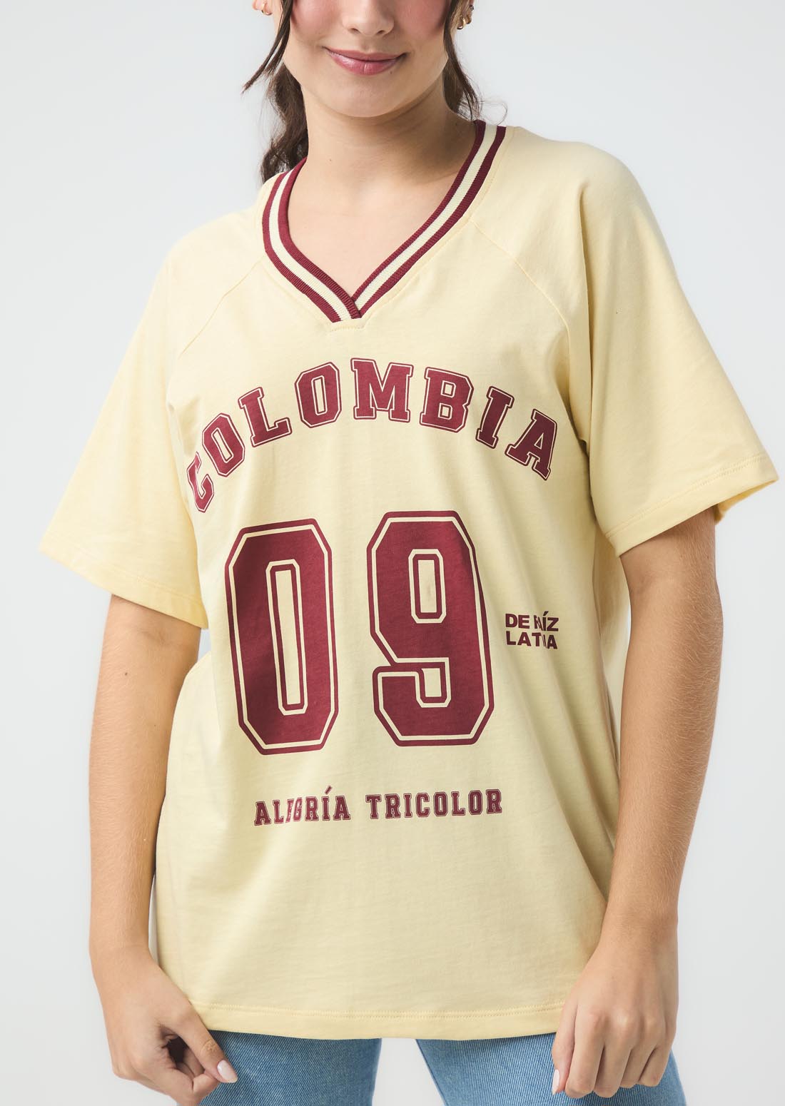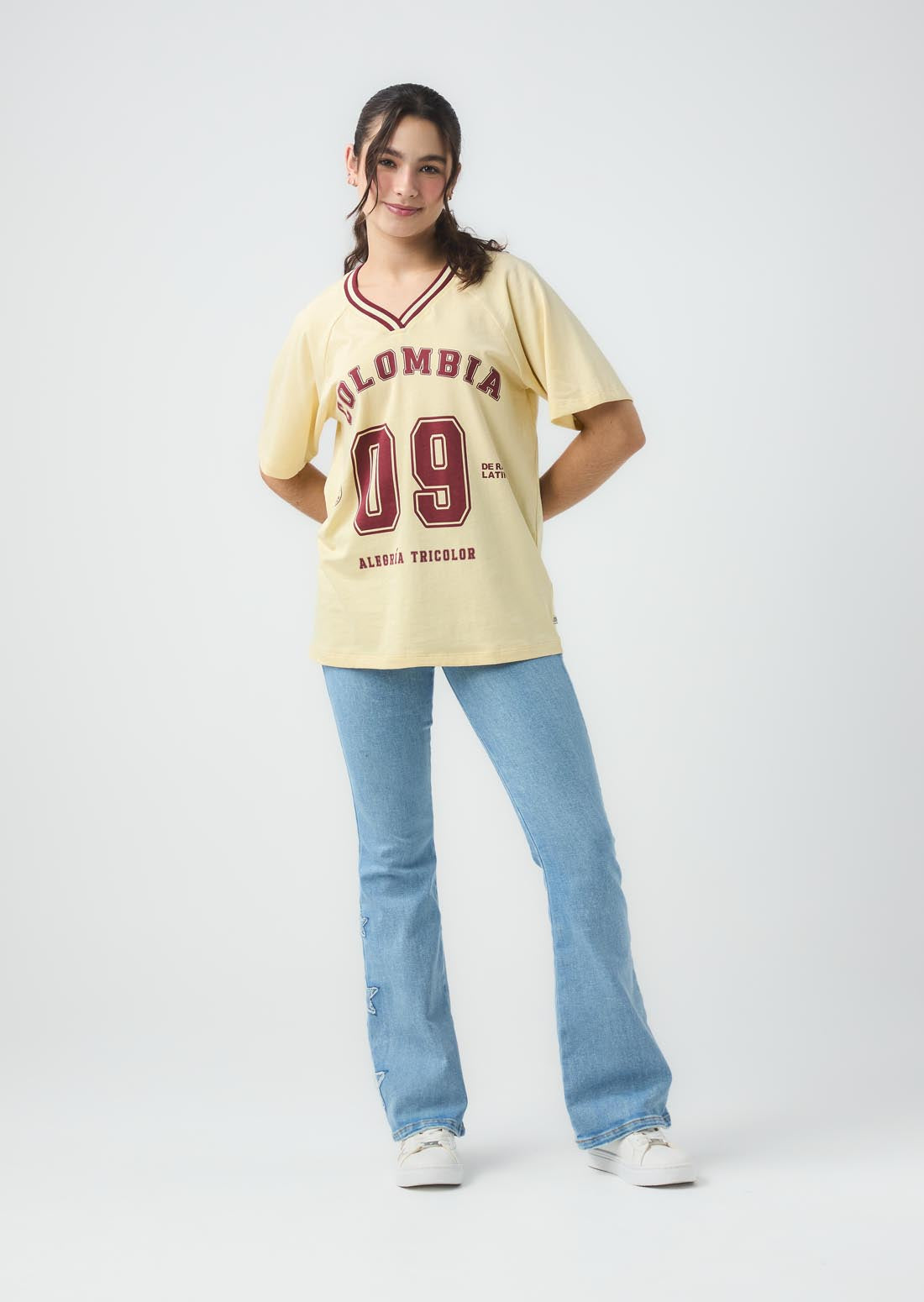 Camiseta de manga corta, color amarillo claro, estampada y cuello en V para jóvenes.