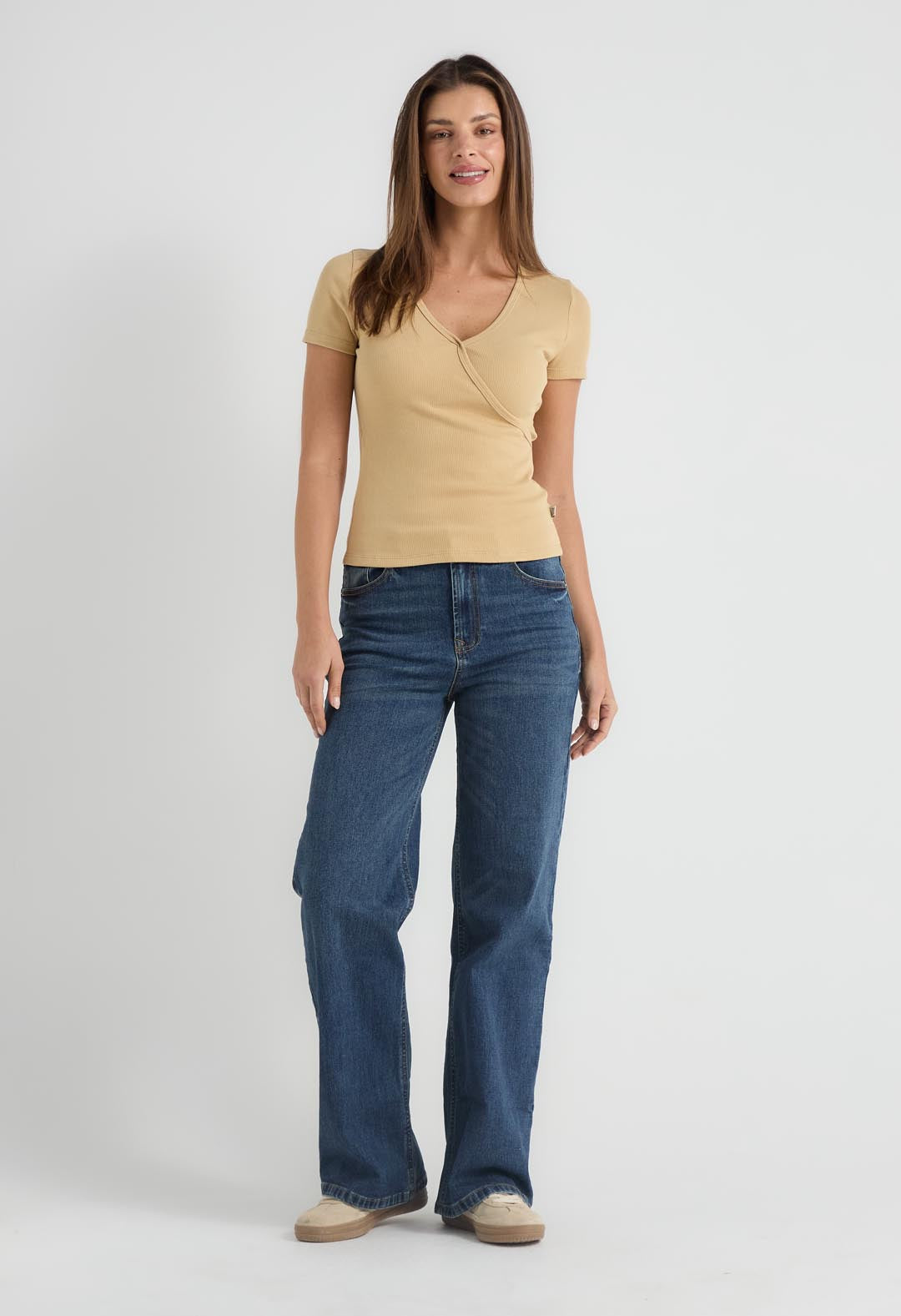 Camiseta manga corta, color arena, en rib y frente cruzado para mujer.