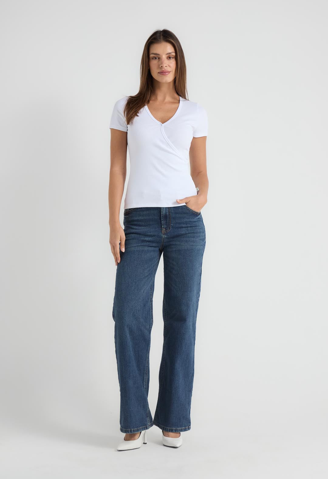 Camiseta manga corta, color blanco, en rib y frente cruzado para mujer.