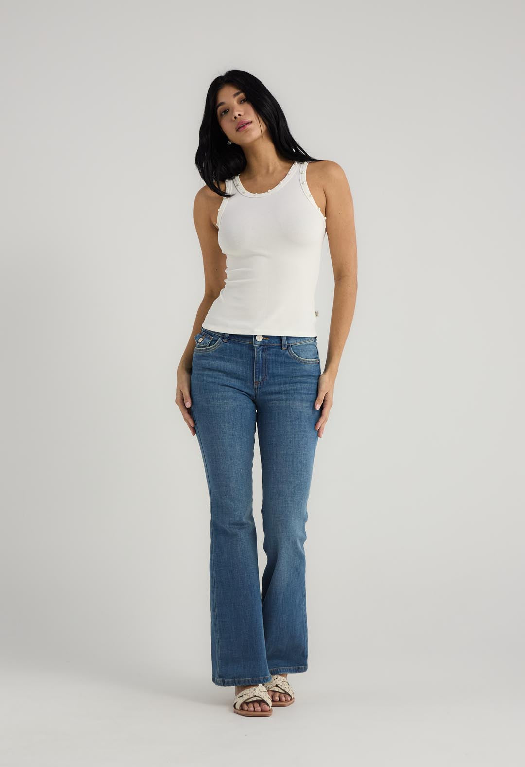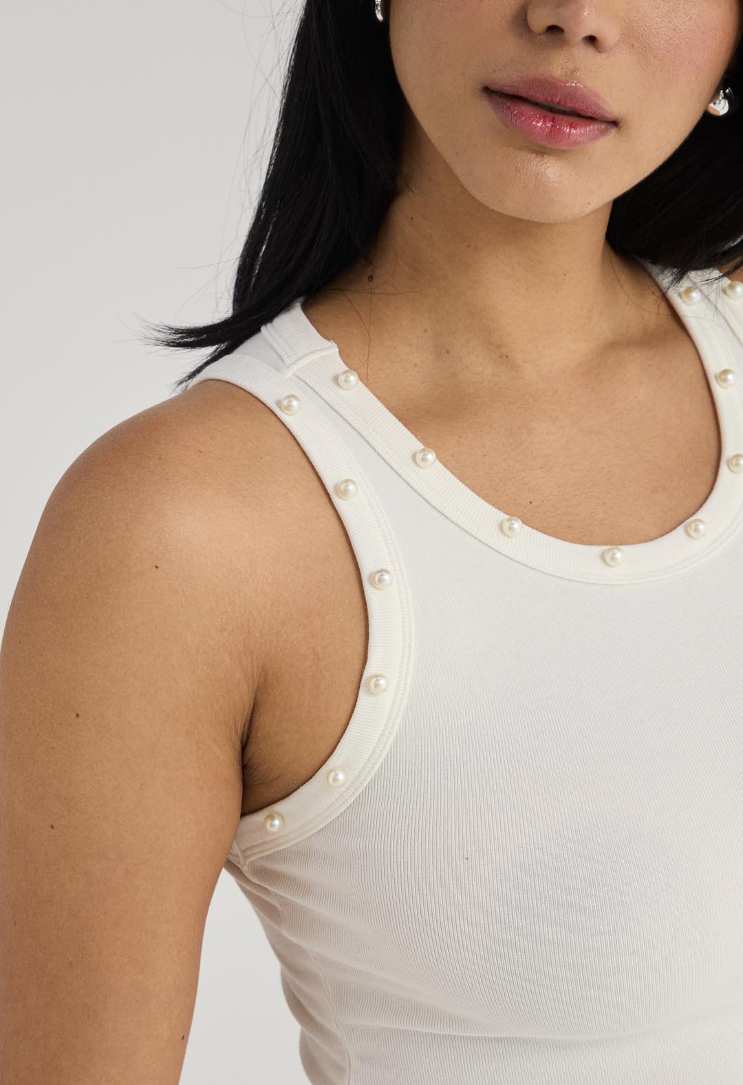 Camiseta manga sisa, color marfil, en rib y perlas en escote para mujer.