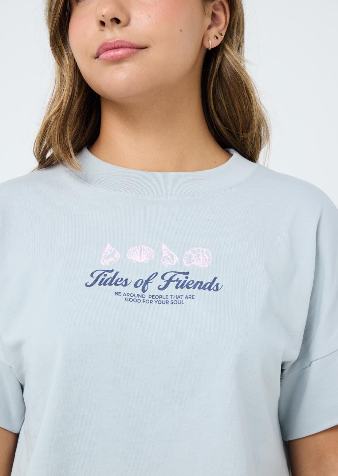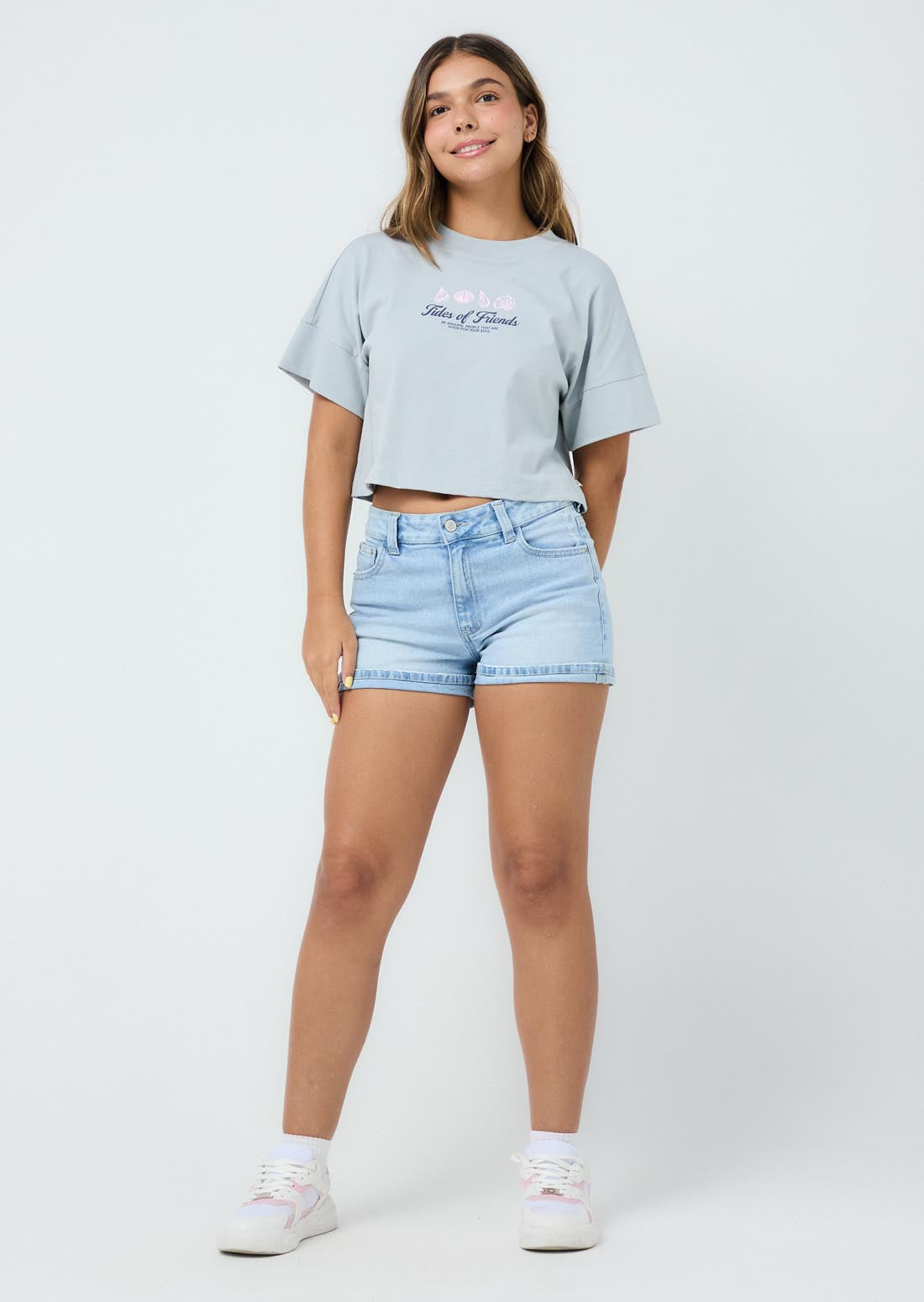 Camiseta manga corta, color gris claro y estampado en frente para jóvenes.