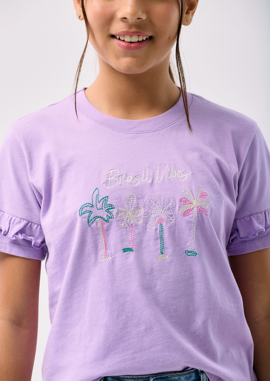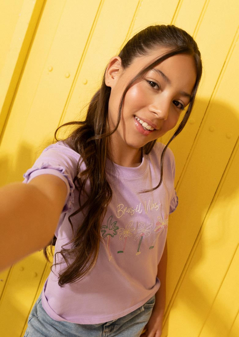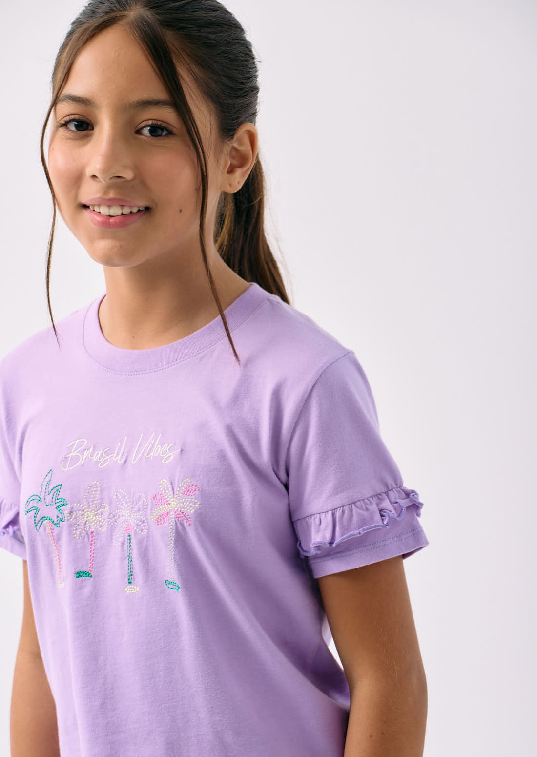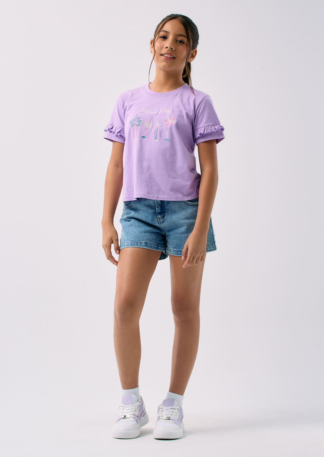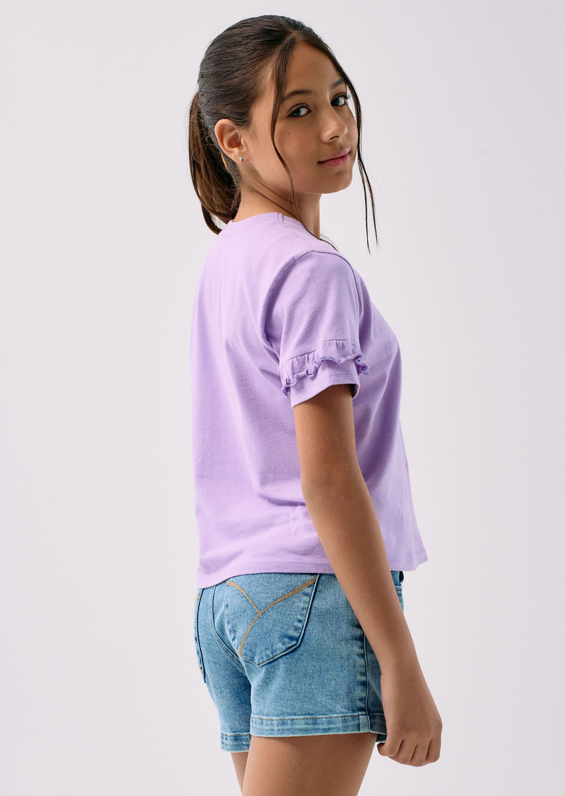 Camiseta manga corta, color lila claro, bolero en mangas y estampado en frente para niñas.