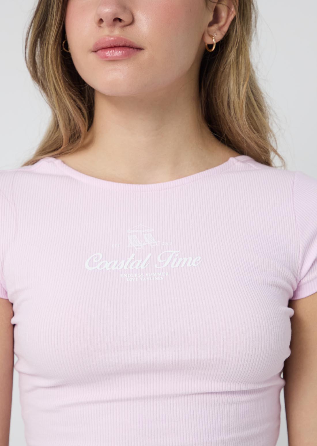 Camiseta manga corta, color lila claro y cuello redondo para jóvenes.