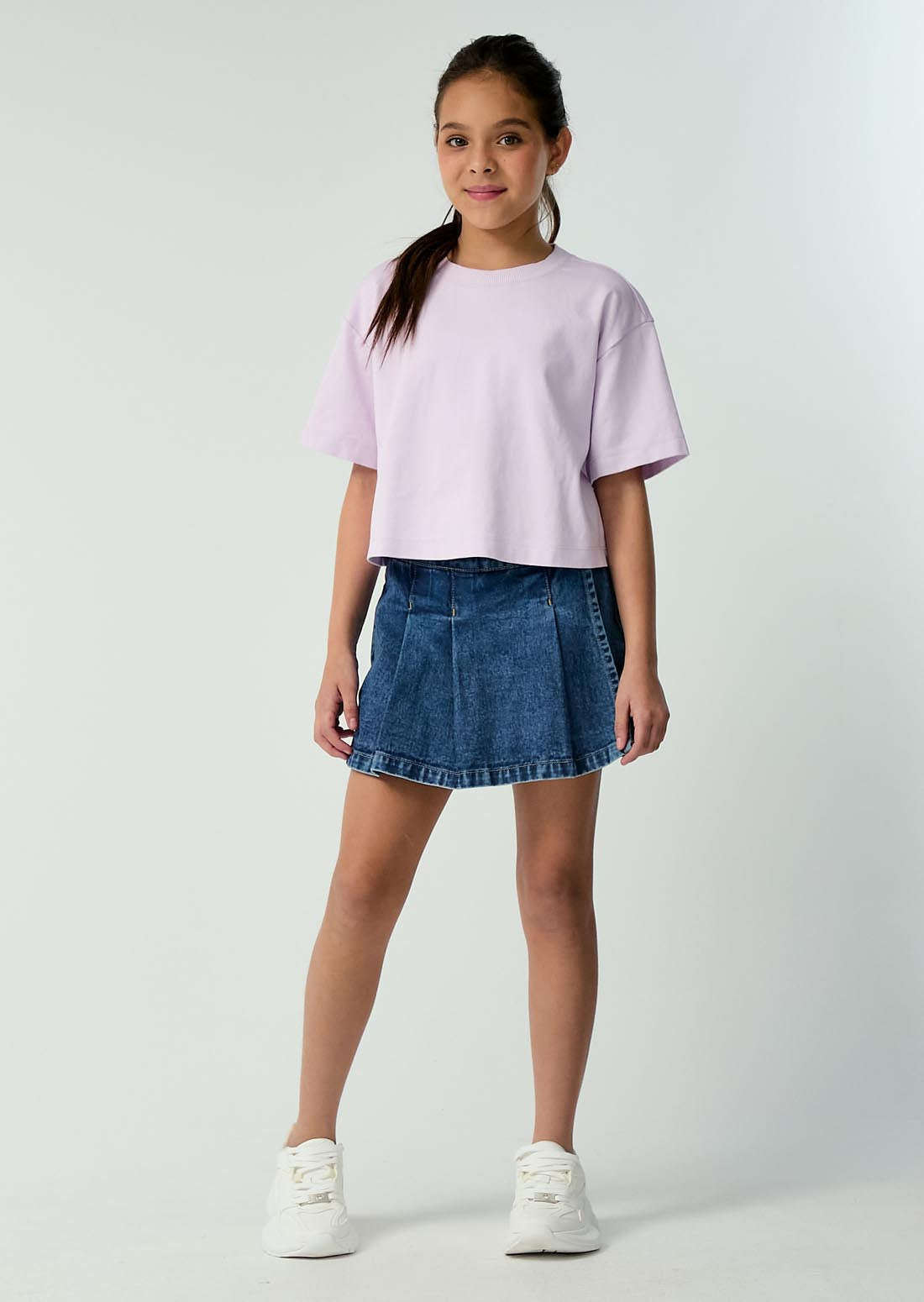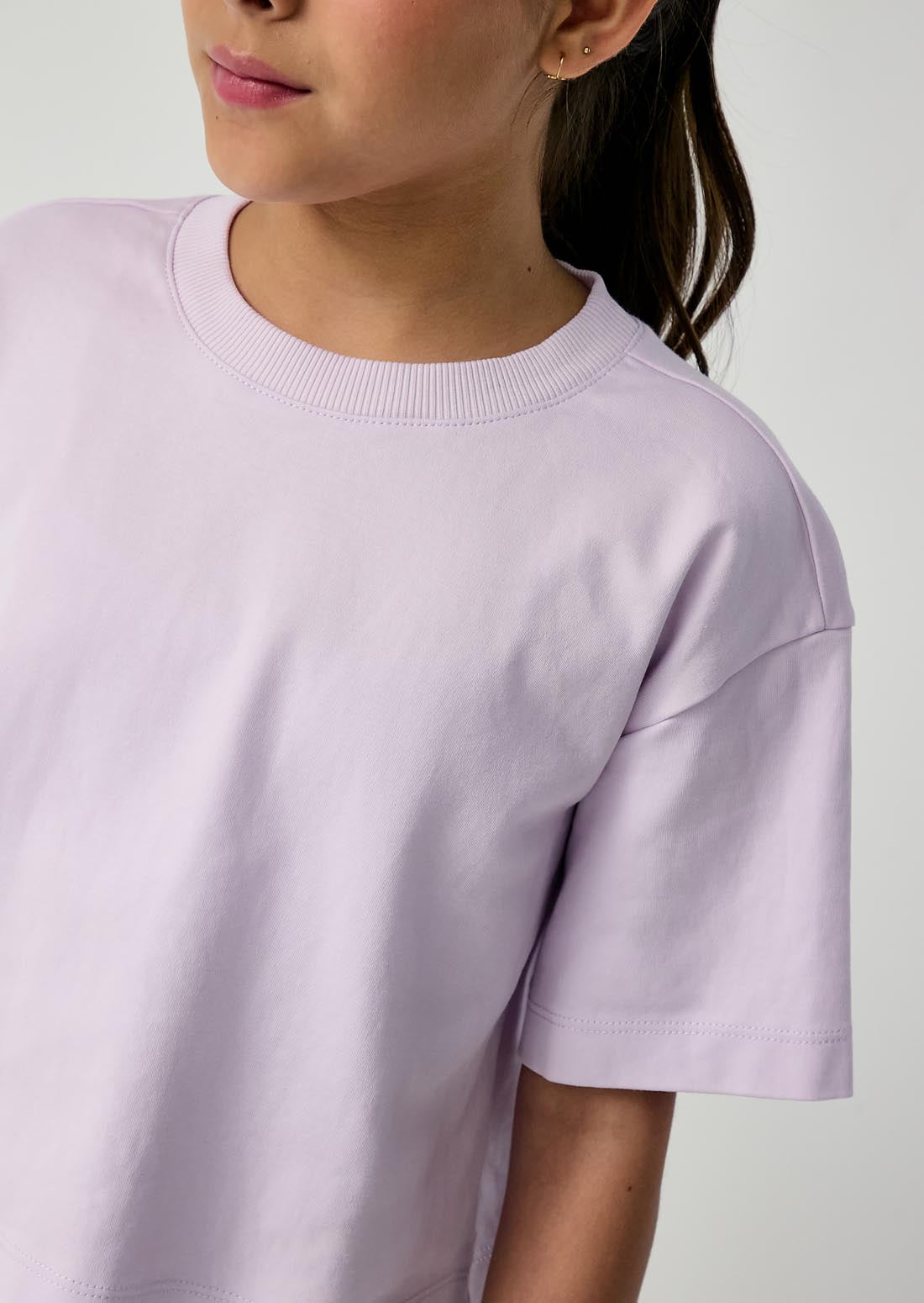 Camiseta manga sisa, color lila claro, cuello redondo, fondo entero y largo crop para niñas.