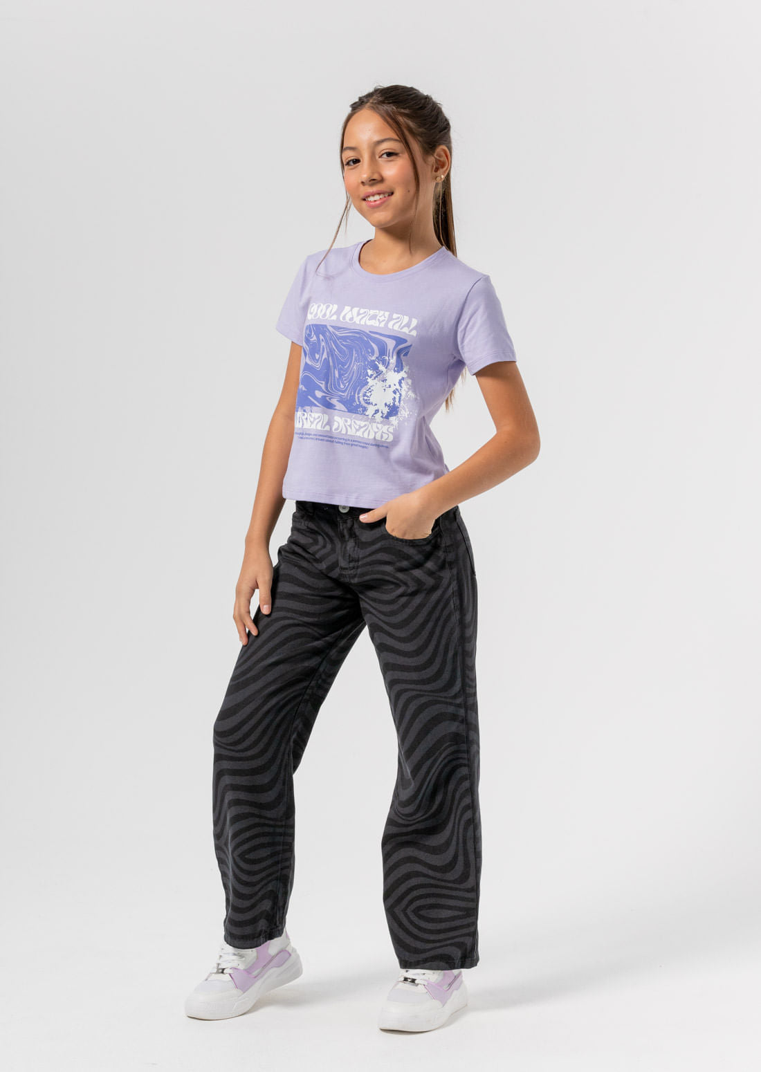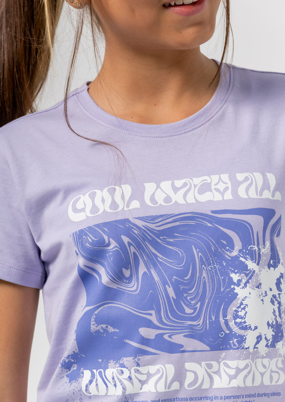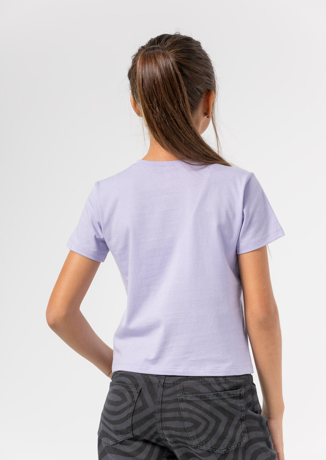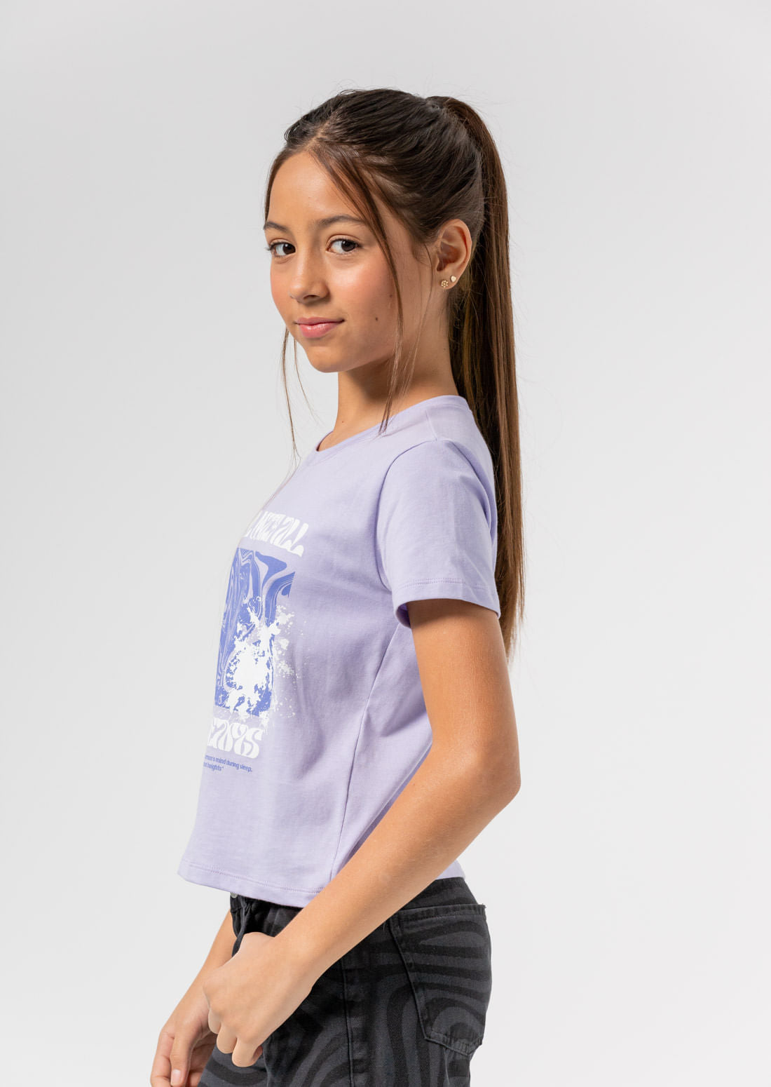 Camiseta manga corta, color lila pastel y frente estampado para niñas.