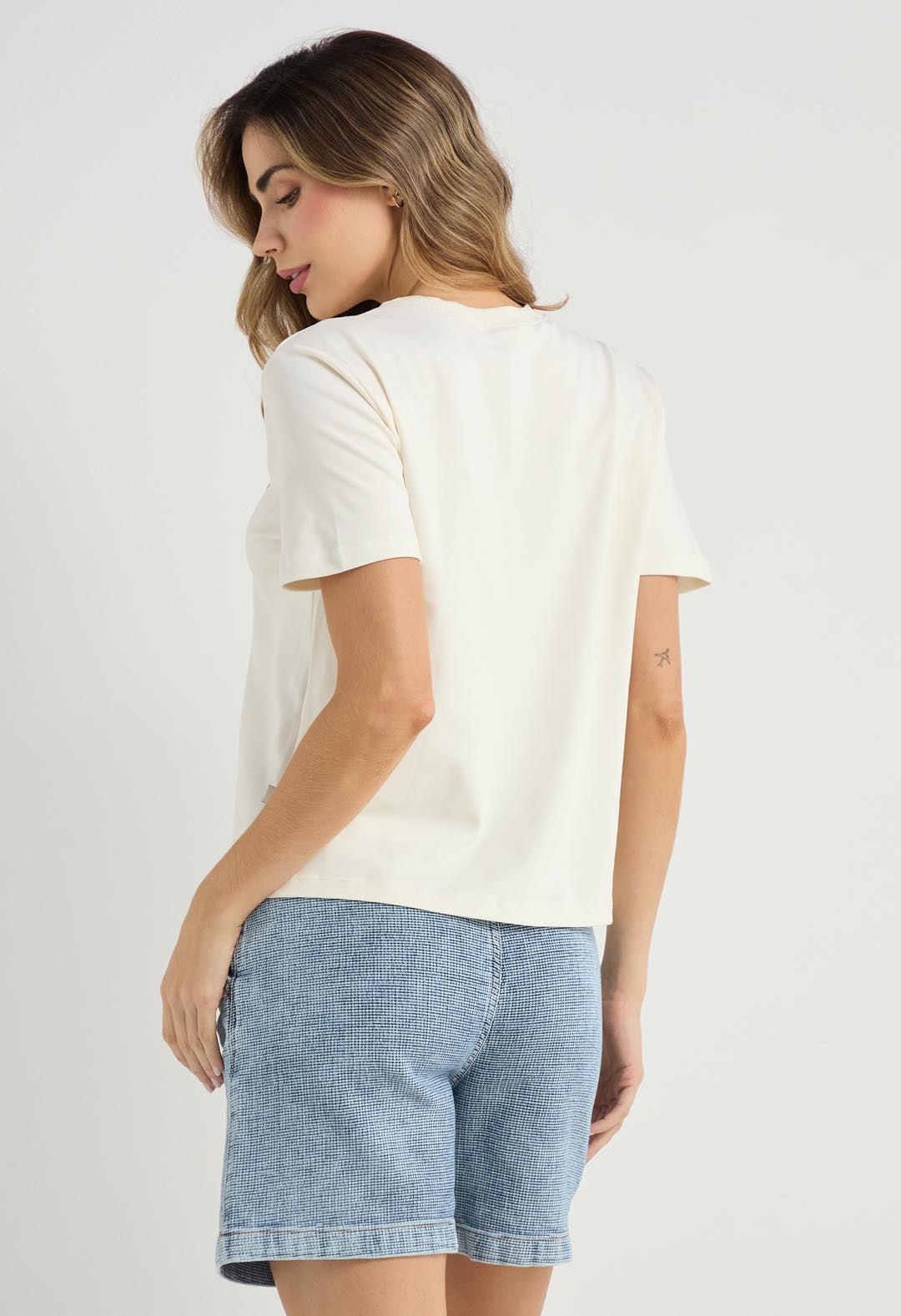 Camiseta manga corta, color marfil, cuello redondo y bordado en frente para mujeres.