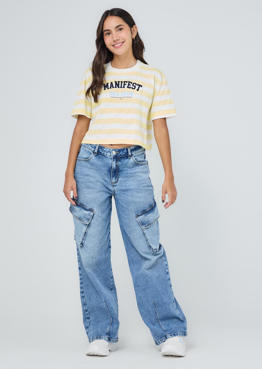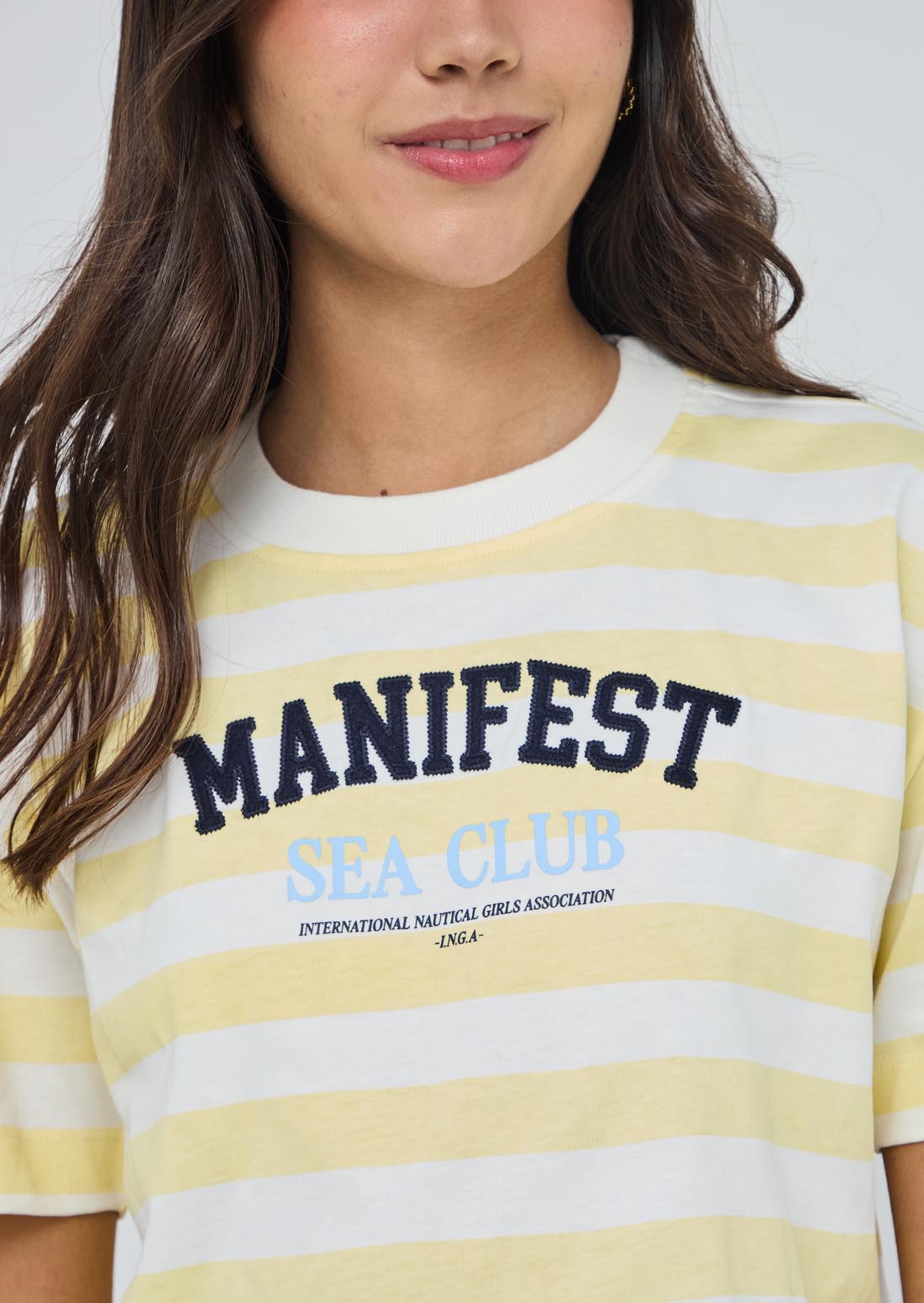 Camiseta a rayas, manga corta, color marfil y estampado en frente para jóvenes.