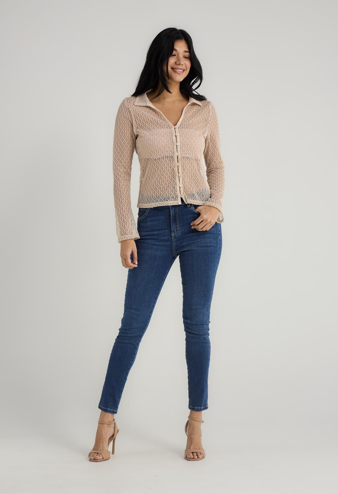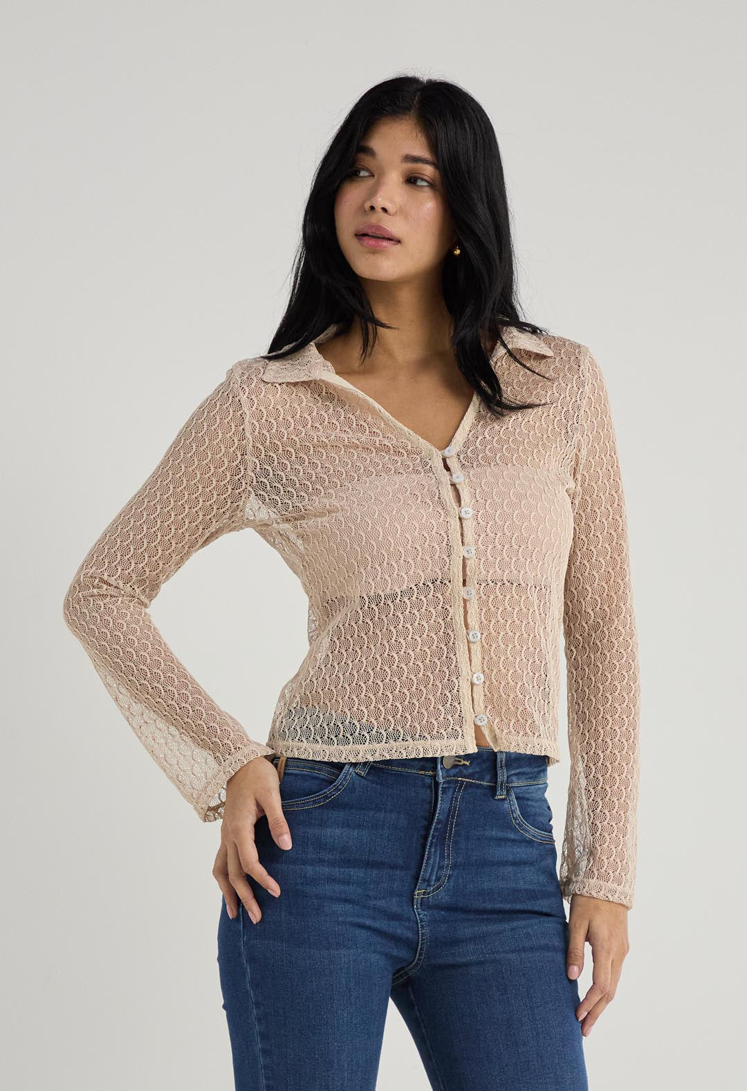 Camiseta manga larga, color arena, botones expuestos y fondo entero para mujer.