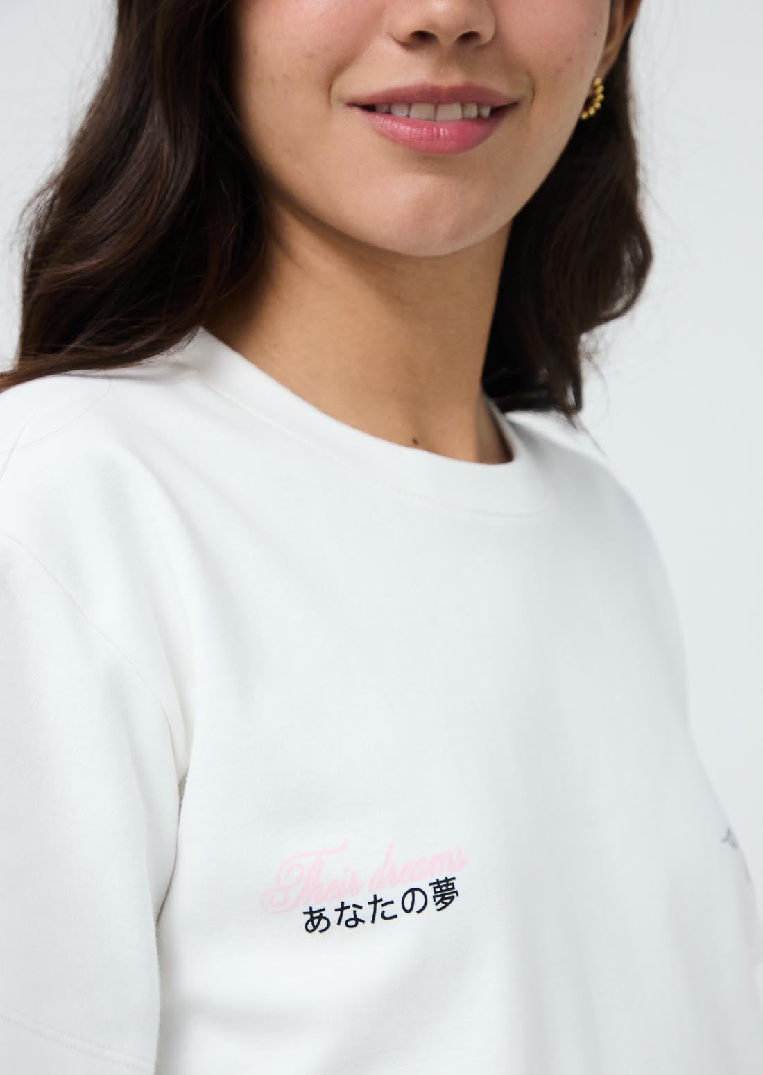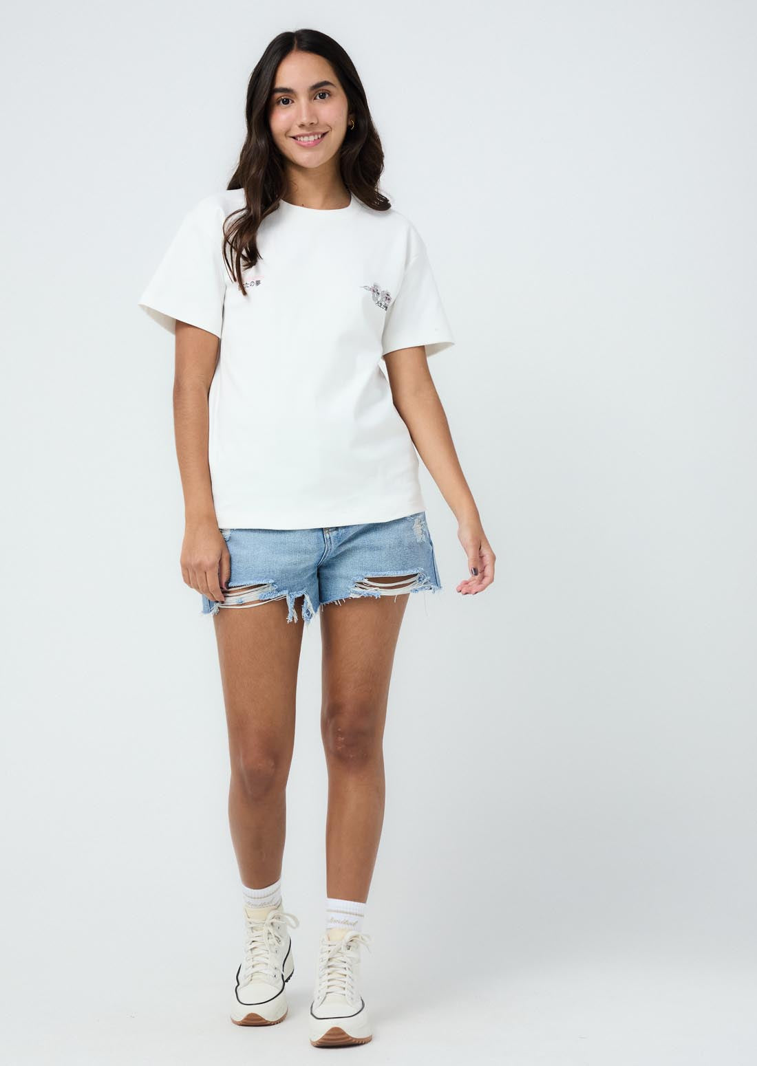 Camiseta manga corta, color marfil, oversize, estampado en frente y espalda para jóvenes.