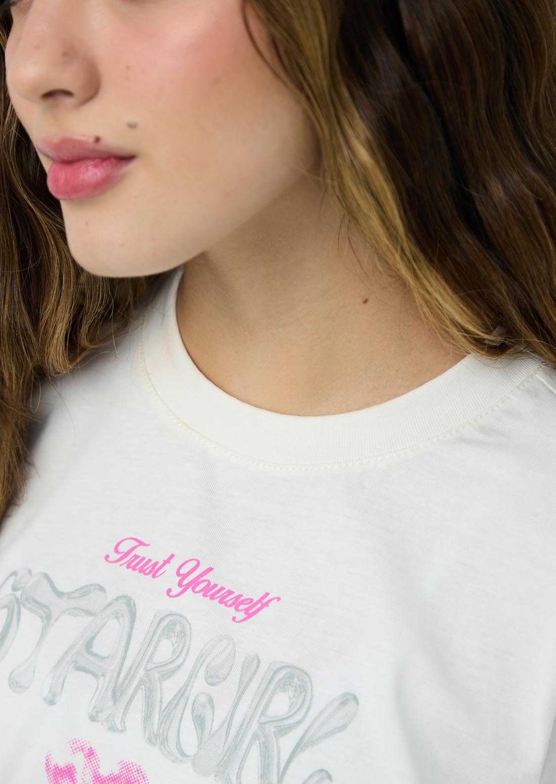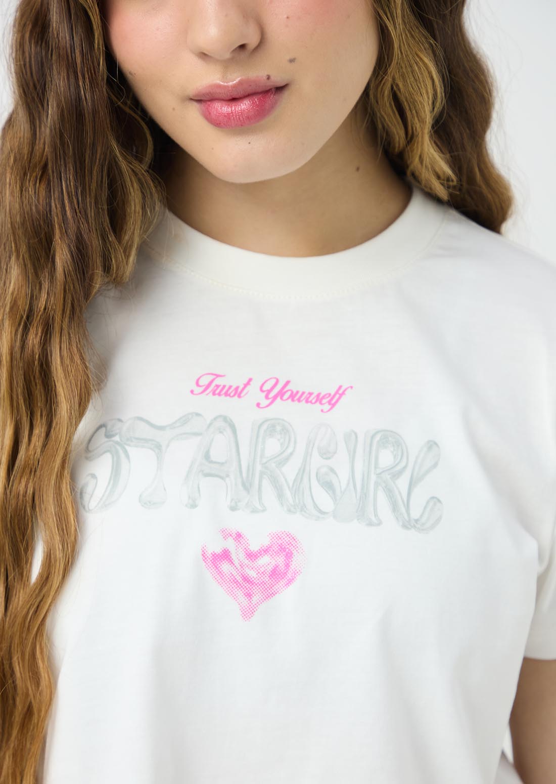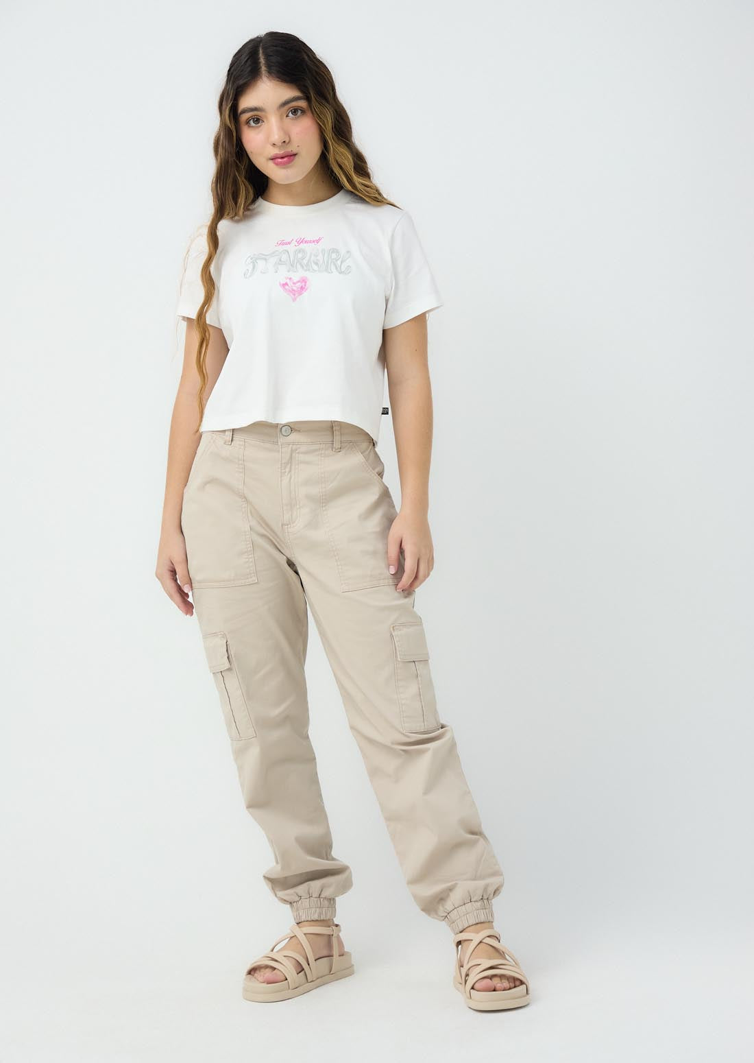 Camiseta manga corta, color marfil, estampado en frente y cuello redondo para jóvenes