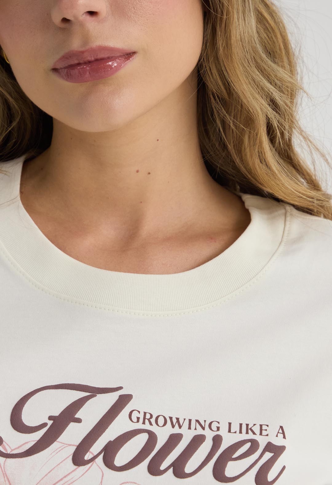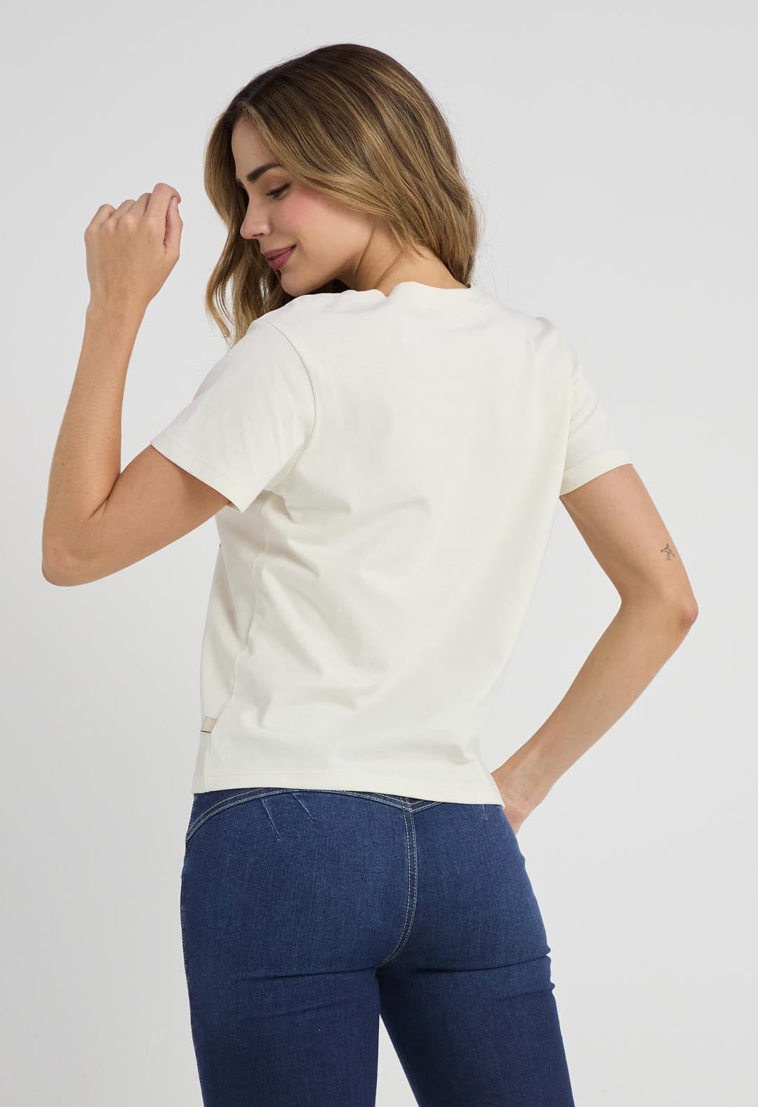 Camiseta manga corta, color marfil y estampado para mujeres.